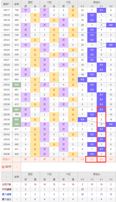 上期质合比:1:2,近10期质合比出现情况:2:1、2:1、1:2、0:3、3:0、2:1、1:2、2:1、1:2、2:1、1:2,最近10期出现4期2:1,出现4期1:2,出现1期0:3,出现1期3:0,根据近10期规律本期推荐隔期出2:1,防连出1:2,综上所述质合比推荐:防:1:2,重点关注:2:1。