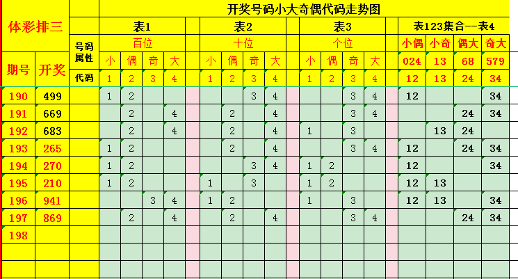 (2)十位号码转换:当开奖号码的十位为小数时转换代码为 1;为偶数时转换代码为 2;为奇数时转换代码为 3;为大数时转换代码为4。见表下2;