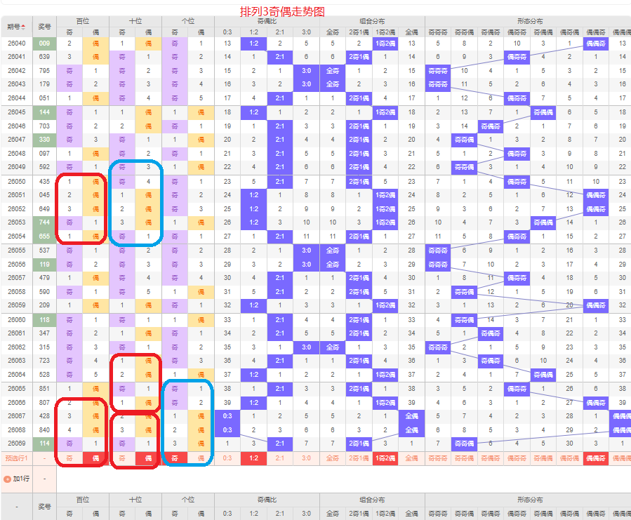 上一期的奇偶比为2:1,俩奇的号码组合,从近五期的奇偶数出现情况看,奇数出5次,偶数出现10次,奇数号码出现较少,本期要侧重两偶的号码组合,侧重偶偶奇或偶奇奇的号码组合,根据奇偶组合形态可做五码定位02468/02468/13579或02468/13579/13579
