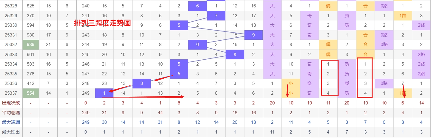 排列三 跨度分析:从上图可以看出近100期的跨度大小比约为48比52,跨度奇偶比约为45比55总体来看还是比较均衡的,但跨度大小之间有点差异。我们再从历史开出1跨后下一期4跨度数据来做参考。最近10期跨度大小比约为4:6期开出大数跨度过多返回小数跨度的概率更高一点。历史开奖近2期出1跨以后的走势为272期开出1跨后下一期走6跨走出5振幅,第261期开出1跨后下一期走4跨走出3振幅第313期开出1跨后下一期开出8跨走出7个振幅。连续多期大振幅,近期排列三的跨度走势来看,6跨表现活跃,呈现明显的热态,短期内可能仍有持续出现的动能,但需注意热极后可能逐渐转温。而4跨目前处于相对冷态,历史回补规律显示,冷跨在遗漏一定周期后往往有较强的回补需求,尤其是当整体跨度分布趋向平衡时,冷号回补概率会显著提升。当前阶段,在关注6跨延续热出的同时,重点防范4跨的突然回补,两者可能形成热冷交替的格局。本期预计跨度遵从历史会走出大振幅,出1跨度后容易走出1到6个跨度振幅的对称形态,跨度走出1到6个振幅看好的跨度有2468跨,所以第2025338期排列三跨度推荐2468跨。