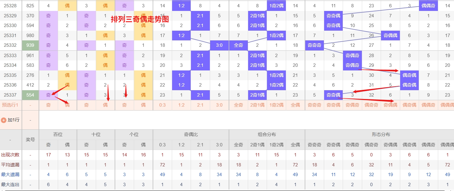 排列三 奇偶分析:从上图可以看出排列三100期内百位奇偶比约为54比46,十位奇偶比为53比47,个位奇偶比为48比52,个位的比值比较均衡,但是百位的比值偏差就有点大,历史奇偶形态近2期开出奇奇偶后下一期的走势为,第262期开出奇奇偶后263期开偶奇奇, 第284期开出奇奇偶后第285期开奇偶偶,第293期开出奇奇偶后第294期开偶偶奇,近期排列三的奇偶形态走势来看,一个非常明确的冷热对峙格局正在形成。一方面,偶奇奇组合已持续遗漏长达32期,达到了一个非常关键的冷态临界点。在概率均衡的规律作用下,此类深度冷号的技术性回补需求正急剧攀升,其任何回补信号都值得高度警惕。另一方面,偶偶奇形态则展现出了强劲的热势,短期内仍有极强的续热可能,所以排列三2025338期奇偶形态推奇偶偶与偶偶奇。