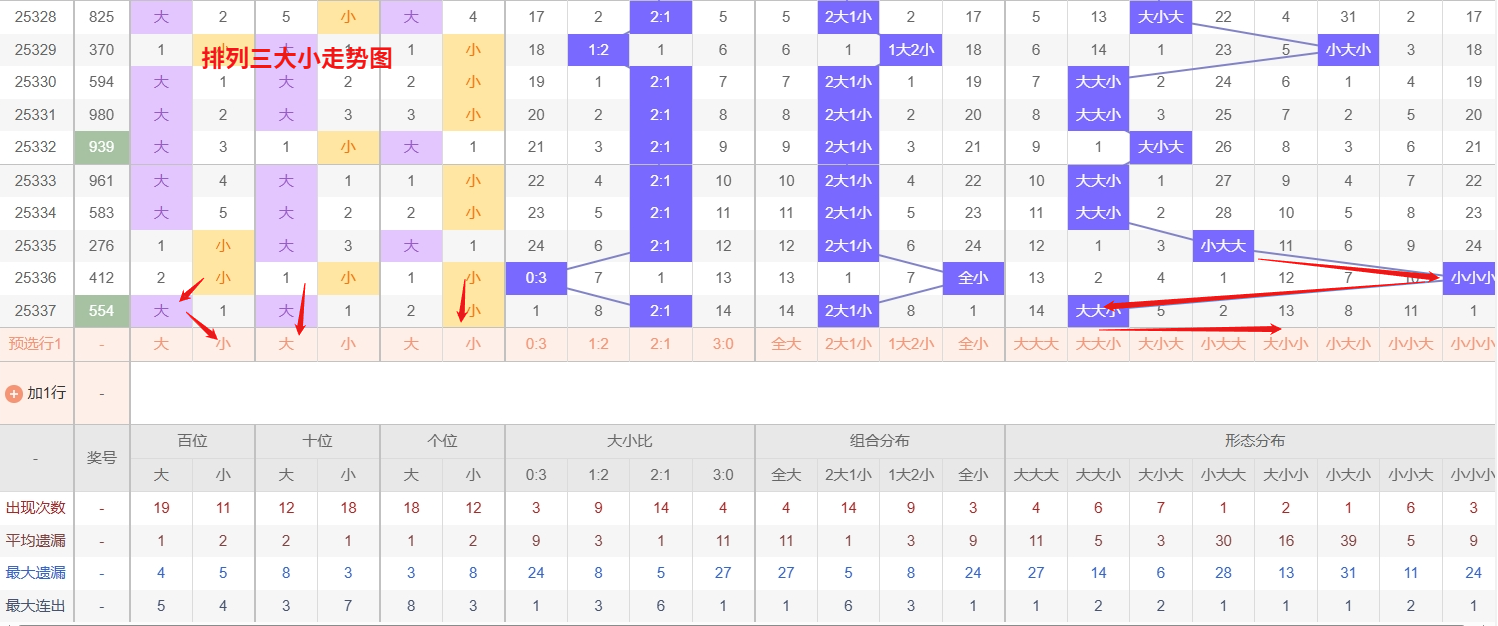 排列三 大小形态分析:从大小走势图上可以看出排列三100期内百位大小比约为45比55,十位大小比约为49:51,个位大小比约为53比47,除了个位奇数比偶数多,十位和百位是偶数比奇数多。历史数据近2期开出大大小下一期的走势为,第271期开出大大小第272期开大小小。第284期开出大大小后第285期开小大小,第297期开出大大小后298期开小小小。近期排列三的大小形态走势分析,小大小与大小小组合均呈现出明显的冷态特征,遗漏周期均已超出常规范围。在大小整体分布动态平衡的内在规律下,此类冷态组合的回补压力正逐渐累积。尤其当多个冷态同时存在时,往往容易形成结构性回补的契机。虽然短期内热号形态可能仍有延续,所以排列三第2025338期大小形态推荐小大小防大小小。