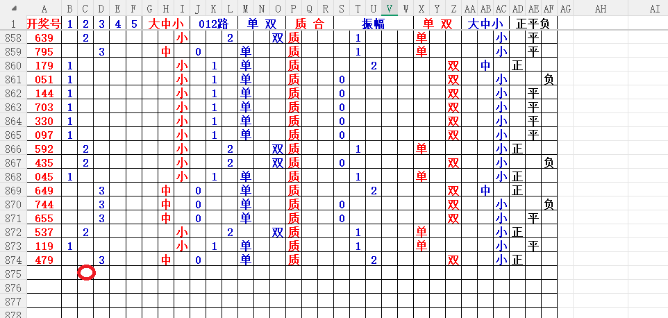 如上图8,012路分析1路出的概率大,本期可以从2路号入手,也就是23数。
