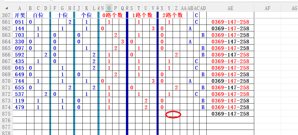 如上图56,012路分析0路出号的概率还是很大,本期可以从0路号入手做胆0369中选;看好369胆码。