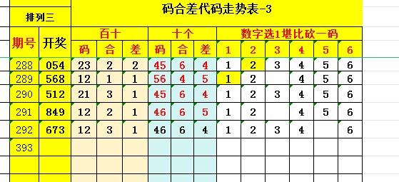 组号的核心关键,在于精准把握码合差。何为码合差?“码” 即开奖号码本身;“合” 指开奖号中三个数字两两相加的和尾;“差” 则是三个数字两两相减的绝对值。为化繁为简,我们将分析重心放在百十位与十个位的码合差上,同时设定专属数字代码:百十位的码合差数字代码 1、2、3,分别对应数字 1=147、2=258、3=0369;十个位的码合差数字代码 4、5、6,分别对应数字 4=147、5=258、6=0369。结合往期开奖数据制作走势图表,从多角度对比号码组合差异,巧用合差选号技巧,进而筛选出高潜力号码组合。(码合差插图 - 3)​ 从以上走势图可推断,本期码合差【147】容错范围为 1-2。​