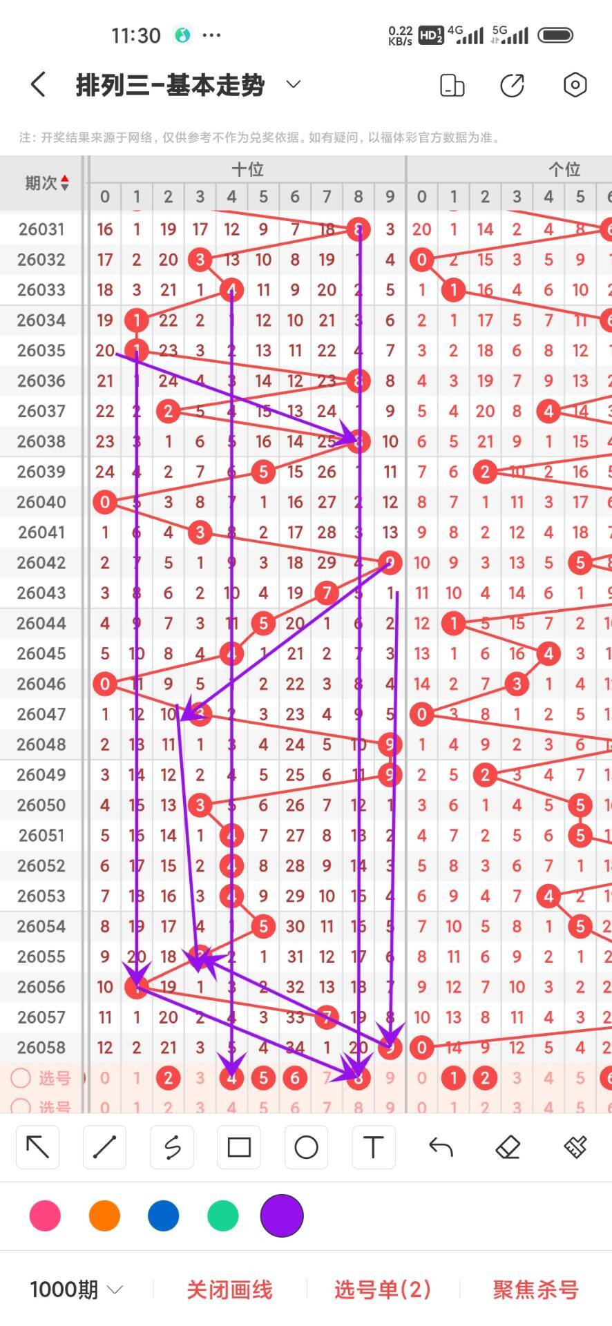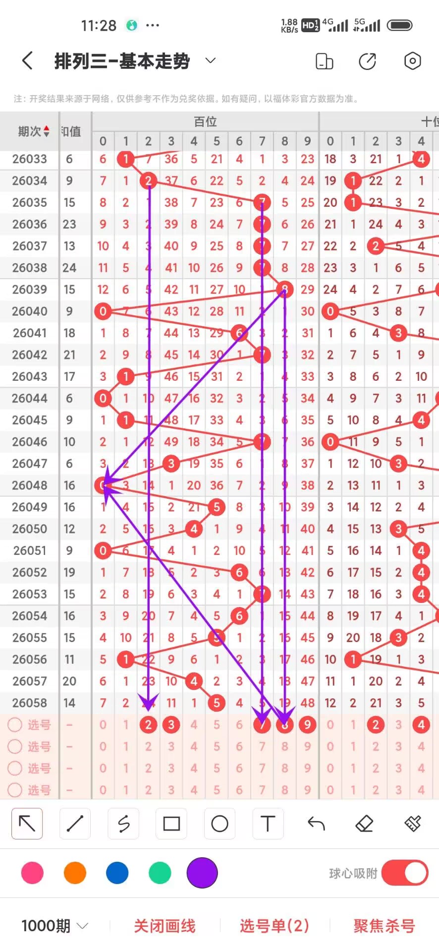 2026059期上期百位开出奇数5,我们通过走势图来看百位上100期,0-9下号数据和最大遗漏数据,其中0出现14次,1出现11次,2出现10次,3出现3次,4出现10次,5出现10次,6出现9次,7出现12次,8出现14次,9出现7次,0-9目前639下号最少,我们在回过头来看最大遗漏下号,0遗漏15次,1遗漏19次,2遗漏26次,3遗漏49次,4遗漏21次,5遗漏36次,6遗漏26次,7遗漏36次,8遗漏19次,9遗漏48次,目前遗漏中39遗漏最大,通过上面的走势分析我们可以看出目前百位上走势比较好的号码是小号,热号是小号我们可以关注下,2893号码走势就有点冷淡,我们可以防守,今天百位我们重点关注23789,具体看下面走势图