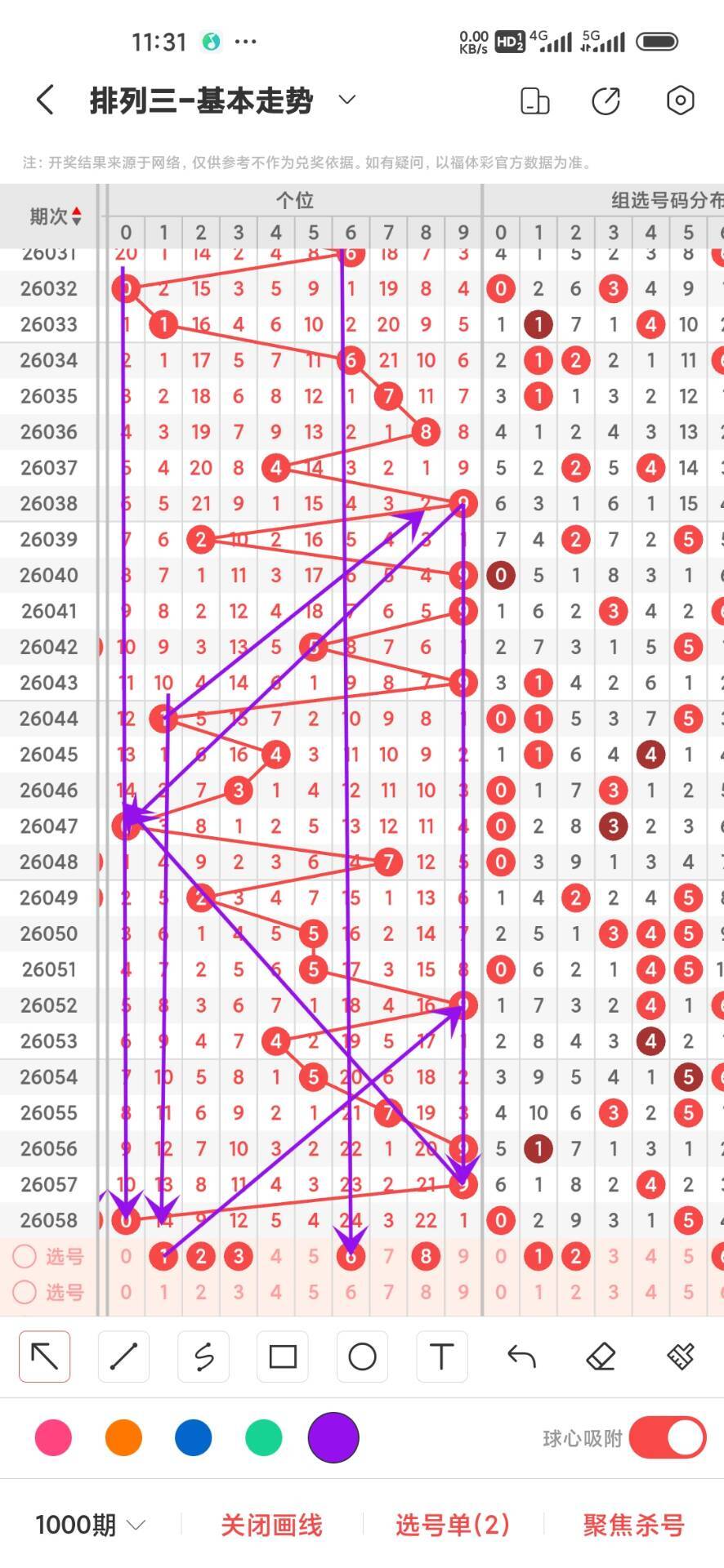 2026059期上期个位开出偶数0,我们通过走势图来看个位上100期,0-9下号数据和最大遗漏数据,其中0出现9次,1出现8次,2出现9次,3出现9次,4出现8次,5出现16次,6出现10次,7出现7次,8出现10次,9出现14次,0-9目前59下号最多,我们在回过头来看最大遗漏下号,0遗漏29次,1遗漏34次,2遗漏21次,3遗漏16次,4遗漏39次,5遗漏22次,6遗漏24次,7遗漏21次,8遗漏32次,9遗漏19次,目前遗漏中14遗漏最大,通过上面的走势分析我们可以看出目前个位上走势比较好的号码是大号,热号是奇数我们可以关注下,1368号码走势就有点冷淡,我们可以防守,今天个位我们重点关注12368,具体看下面走势图