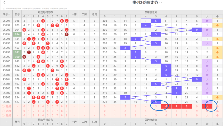 通过观察跨度及跨度属性走势可以发现:近10期内跨度大数号码出号数量多于小数号码,可见近期跨度更容易开出大数号码,本期跨度大数号码继续出号可能性高,即本期跨度看好大数号码,再结合上述走势图看,本期跨度看好678等号码。