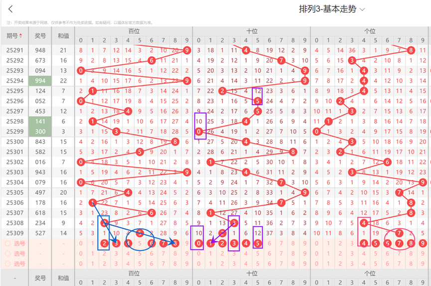 上一期百位开出号码为5,为奇数、大数、质数、2路号码:近10期百位较少开出09等号码,本期百位大概率不会开出09等号码,因此本期百位选号时应该考虑09以外的号码,结合上述走势图看,本期百位看好234678等号码。