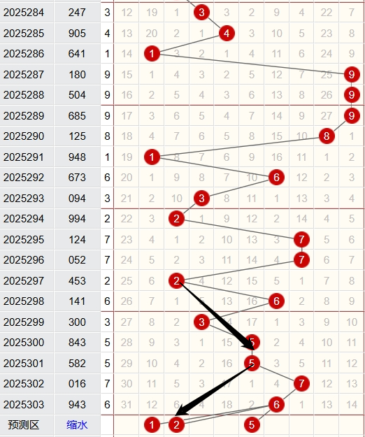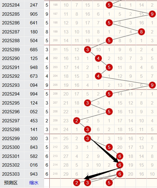 上期跨度为6,近5期跨度开出情况:第25299期开出3,属于奇数,0路号码,木属性;第25300期开出5,属于奇数,2路号码,土属性;第25301期开出6,属于偶数,0路号码,水属性;第25302期开出6,属于偶数,0路号码,水属性;第25303期开出6,属于偶数,0路号码,水属性;