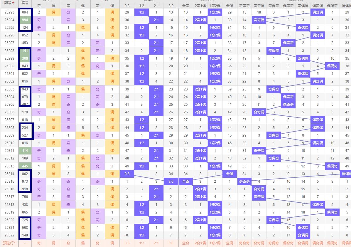 大小走向分析: 在排列3中,大小走势是判断号码分布的重要依据。根据322期开奖结果148,大小比为1:2;形态奇偶偶形态。结合历史走势图,发现近10期大小比例为20:10,大数保持优势;因此,323期关注的大小比例可以是2:1或者1:2,可能会出现一个大奖号和两个小奖号,应充分考虑这一趋势,合理分配投注比例。防全小号码.