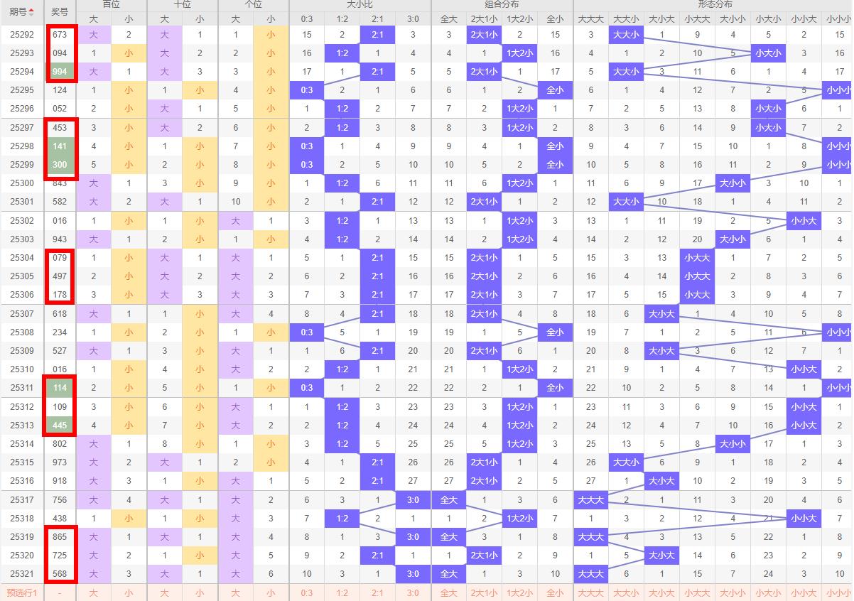 排列3/322期综合分析报告 :321期开奖号码为568跨度3和值为19奇偶偶,大大大.的形态。