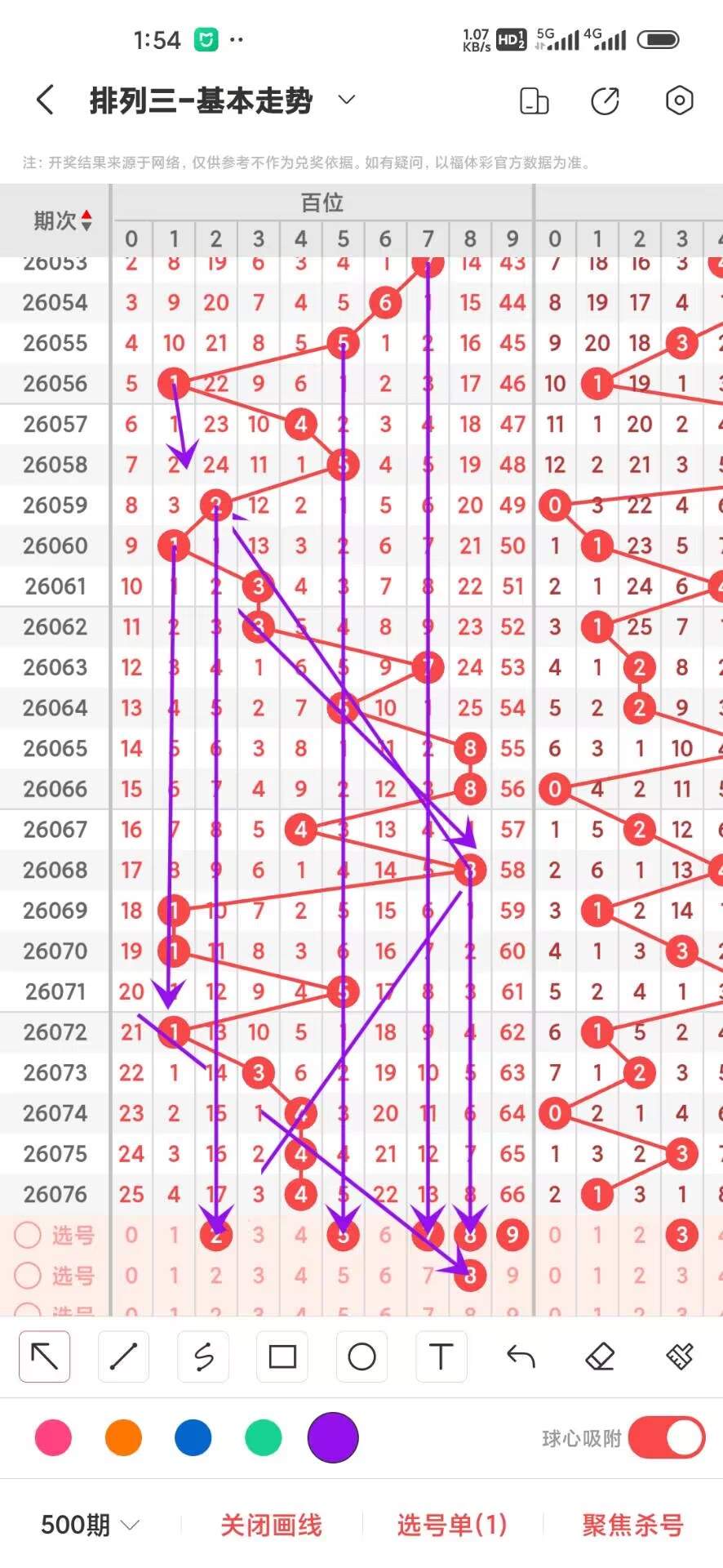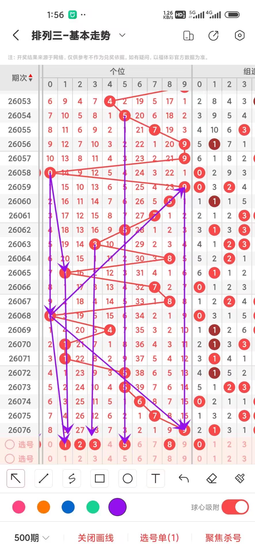 2026077期上期个位开出奇数9,我们通过走势图来看个位上500期,0-9下号数据和最大遗漏数据,其中0出现44次,1出现52次,2出现50次,3出现60次,4出现50次,5出现52次,6出现43次,7出现54次,8出现53次,9出现42次,0-9目前13578下号最多,我们在回过头来看最大遗漏下号,0遗漏45次,1遗漏34次,2遗漏30次,3遗漏36次,4遗漏39次,5遗漏53次,6遗漏44次,7遗漏24次,8遗漏40次,9遗漏54次,目前遗漏中59遗漏最大,通过上面的走势分析我们可以看出目前个位上走势比较好的号码是大号,我们可以关注下,23号码走势就有点冷淡,我们可以防守,今天个位我们重点关注12358,具体看下面走势图