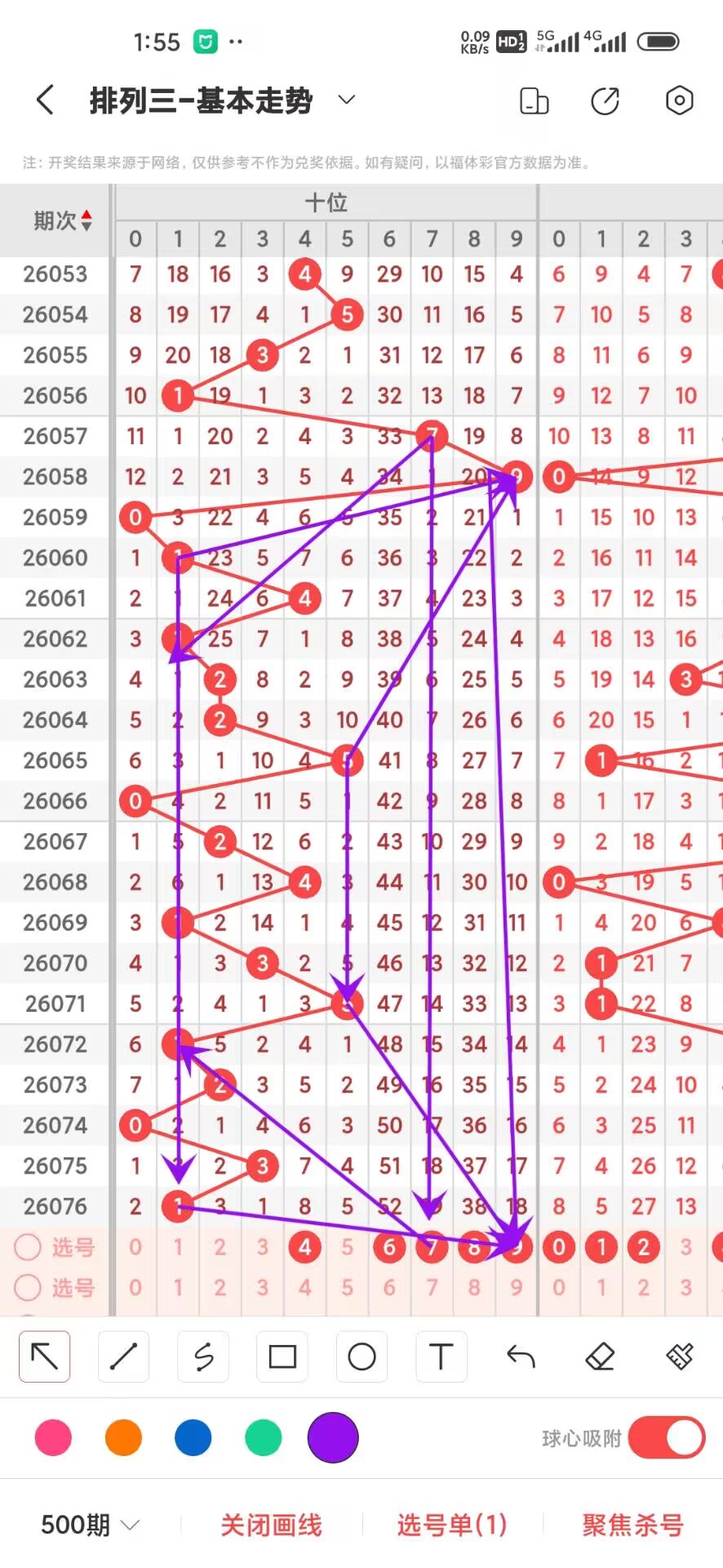 2026077期上期十位开出奇数1,我们通过走势图来看十位上500期,0-9下号数据和最大遗漏数据,其中0出现44次,1出现57次,2出现56次,3出现47次,4出现54次,5出现45次,6出现33次,7出现62次,8出现49次,9出现53次,0-9目前12479下号最多,我们在回过头来看最大遗漏下号,0遗漏44次,1遗漏28次,2遗漏31次,3遗漏44次,4遗漏39次,5遗漏32次,6遗漏52次,7遗漏29次,8遗漏38次,9遗漏24次,目前遗漏中06遗漏最大,通过上面的走势分析我们可以看出目前十位上走势比较好的号码是小号,我们可以关注下,6789号码走势就有点冷淡,我们可以防守,今天十位我们重点关注56789,具体看下面走势图