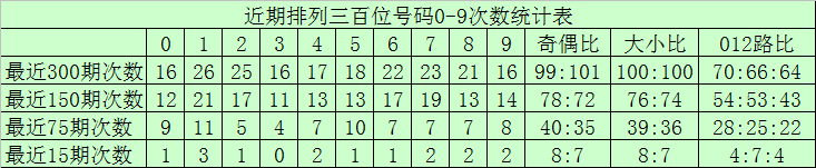 百位分析:最近300期奖号由冷到热表现为:0→21次,3、4、5、9→28次,6→30次,8→31次,2→33次,7→36次,1→37次,奖号奇偶比为157:143,大小比为153:147,012路比为107:101:92。