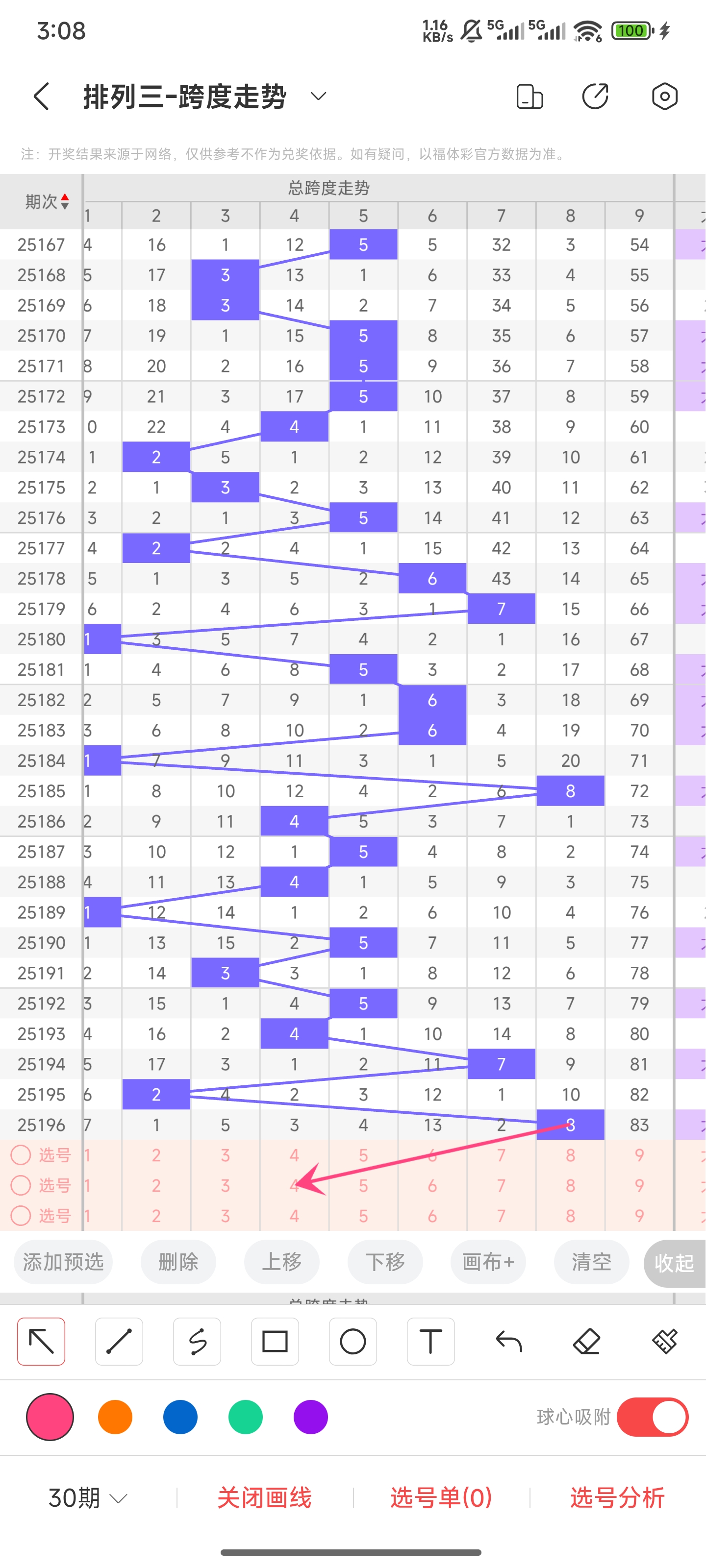 上期跨度为8,往前一期跨度是2,跨度往右偏移了6个点,偏移比较大。又因为跨度8已经是比较大的跨度了,通过分析走势图,目前比较大概率跨度是往左的了,所以推测本期跨度可能为34567等跨度。