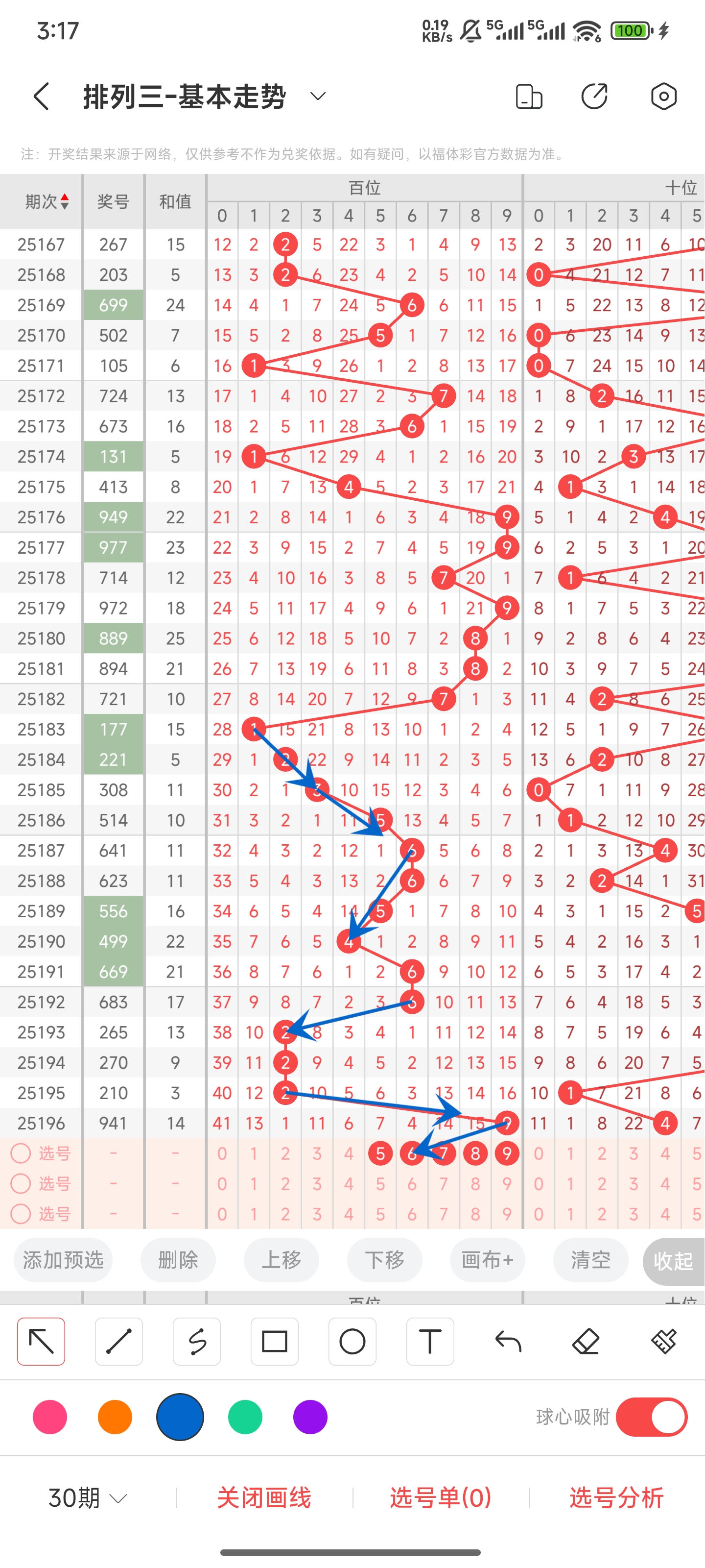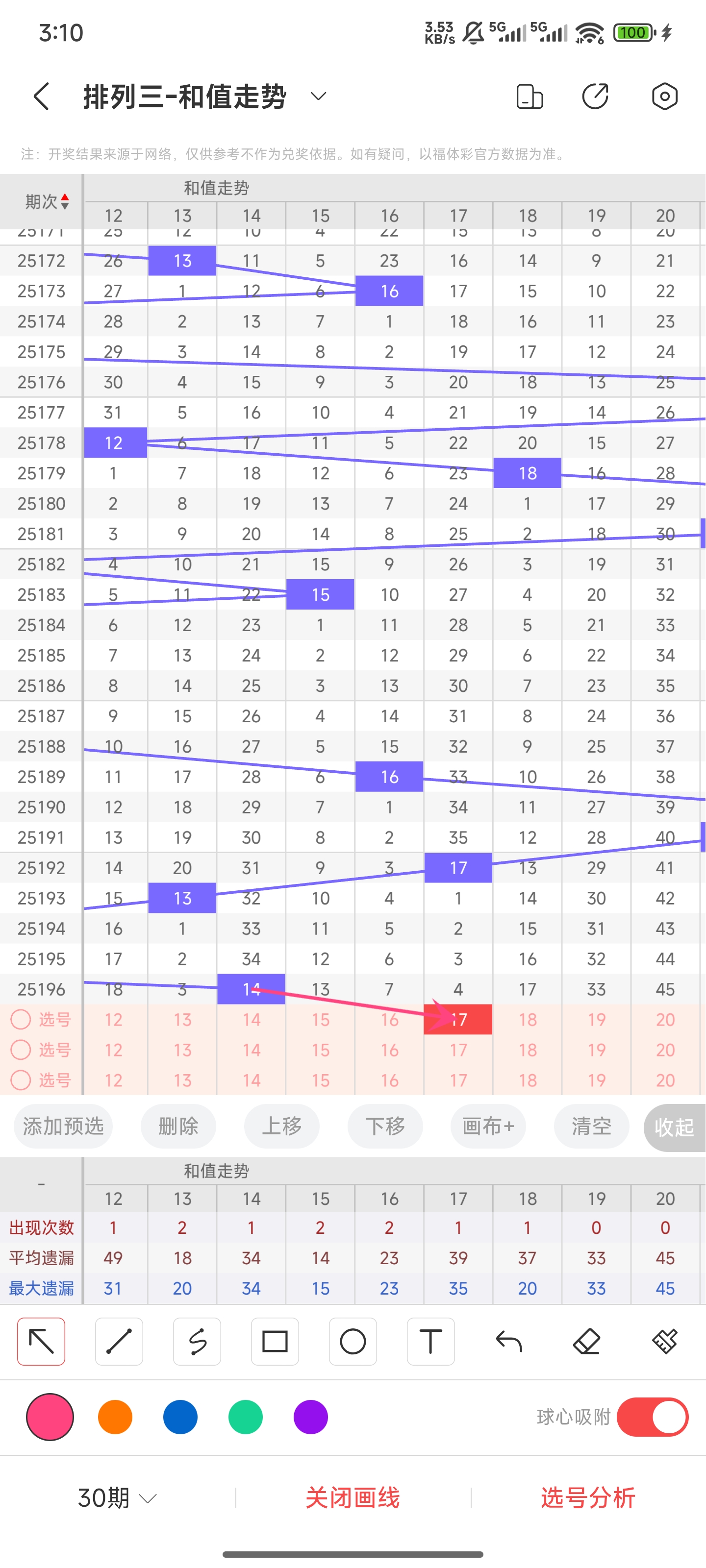 上期和值为14,往前一期和值为3,向右偏移了11个点位。偏移量也是比较大了。14是目前30期内开出的和值中中等偏小的值。有比较大的上升空间。结合走势图趋势,本期趋势应该会往右走的了,和值增大。
