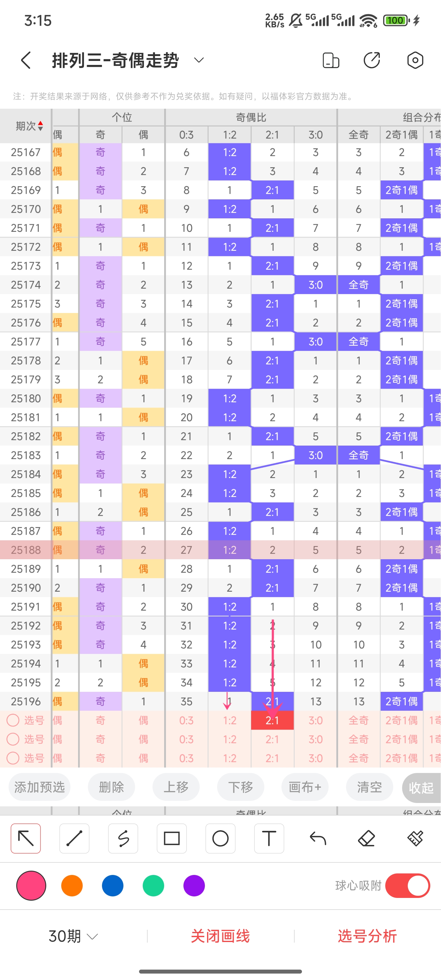 上期开出了2:1的奇偶比,分别为奇偶奇。往前一期是1:2。由于2:1奇偶比的回归,通过分析目前30期数据,开出1:2奇偶比的概率变为50%,开出2:1奇偶比的概率变为40%,开全奇的概率还是为10%,开出全偶的概率为0%。可以看到目前1:2奇偶比和2:1奇偶比概率已经趋于接近了。所以本期比较大概率是还继续开出2:1奇偶比,小概率开1:2奇偶比。
