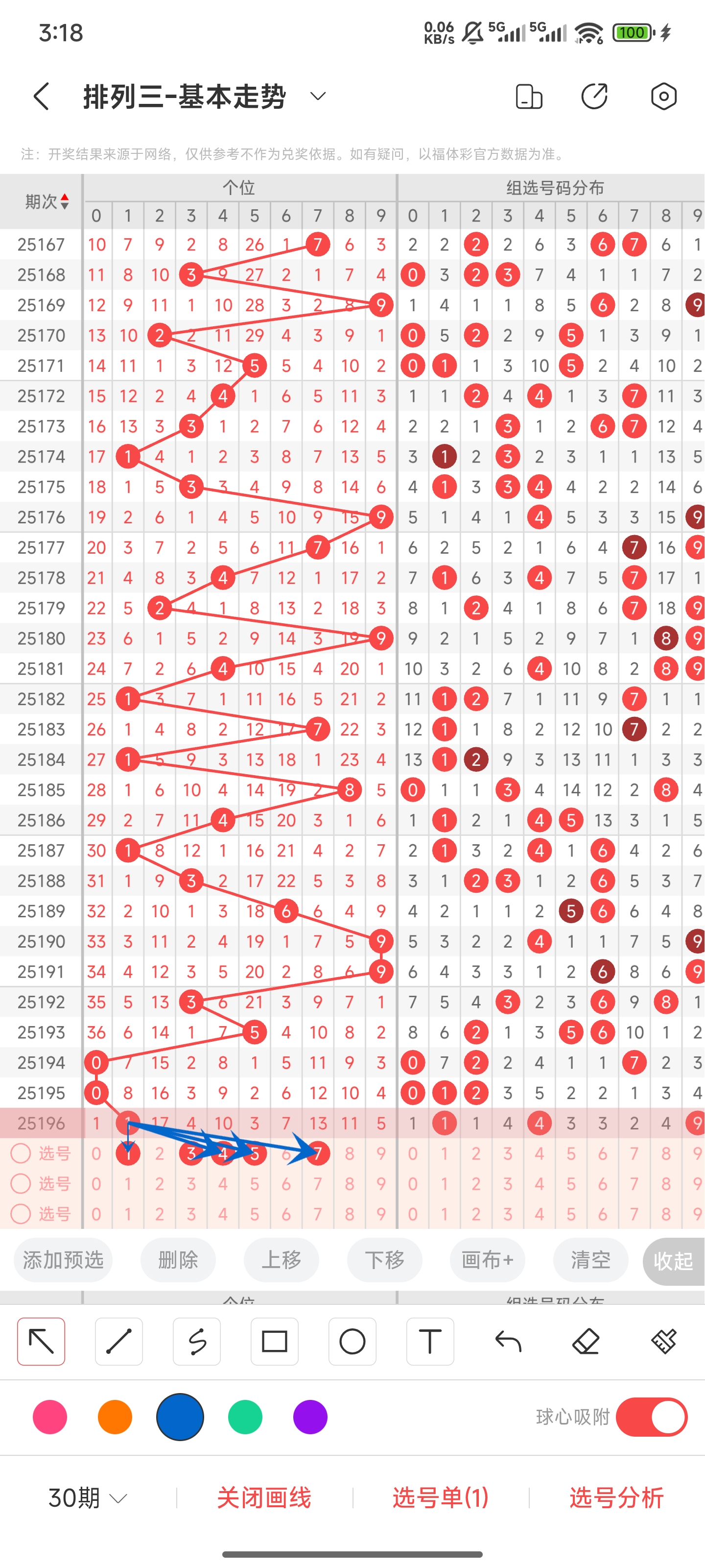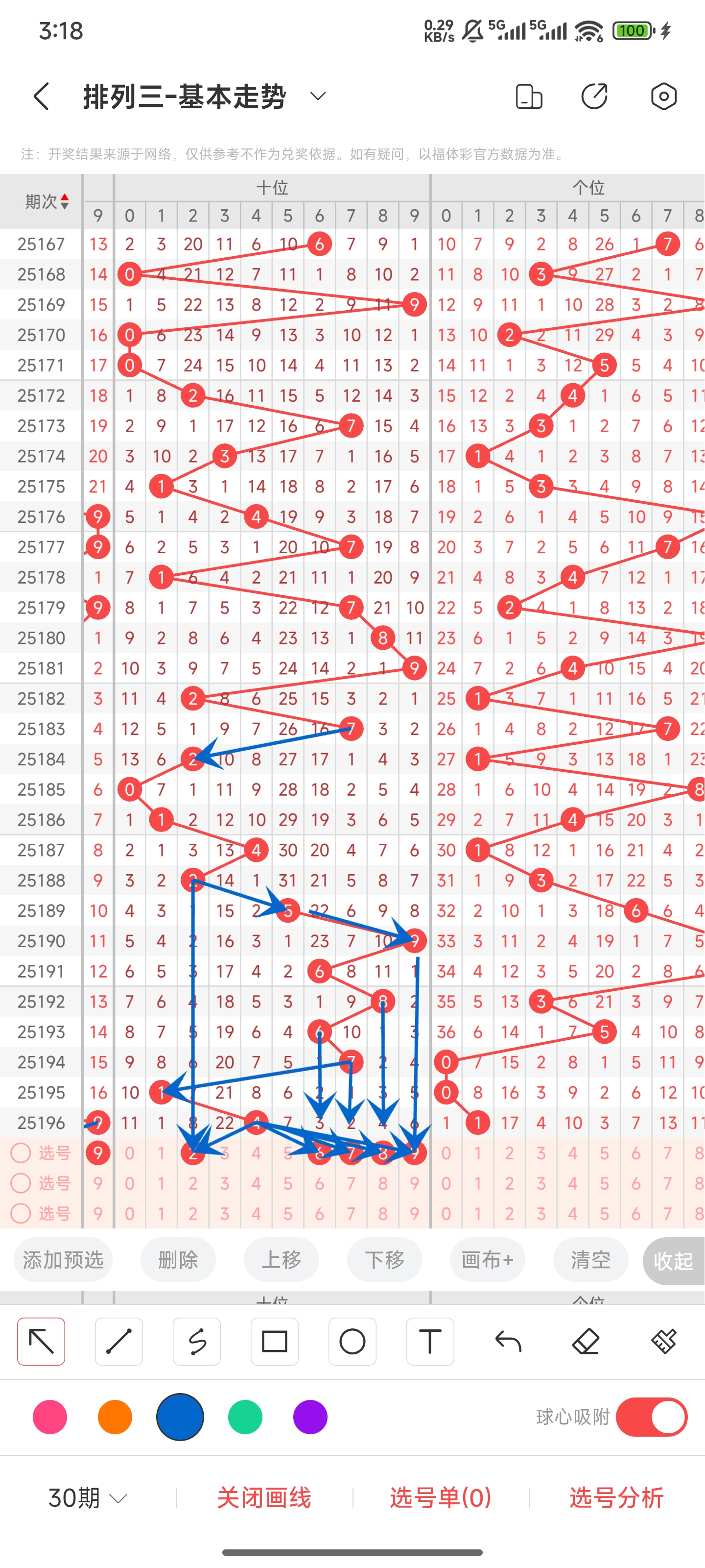 上期开出了09号球。往前一期开出的是02号球。趋势是从左往右,偏移了7个点。走势突然变陡。通过分析走势图,我们可以发现走势大多数时候比较平缓是常态,小部分会突然变陡,然后又恢复较为平缓的走势。因为09目前也是一个比较热门的号码了,可以考虑一下连出。目前走势是应该往右的了,前面我们分析走势不会陡了,所以我们就可以关注附近的号码05,06,07,08。综上所述本期我们推测可能会开出05,06,07,08,09等号码。