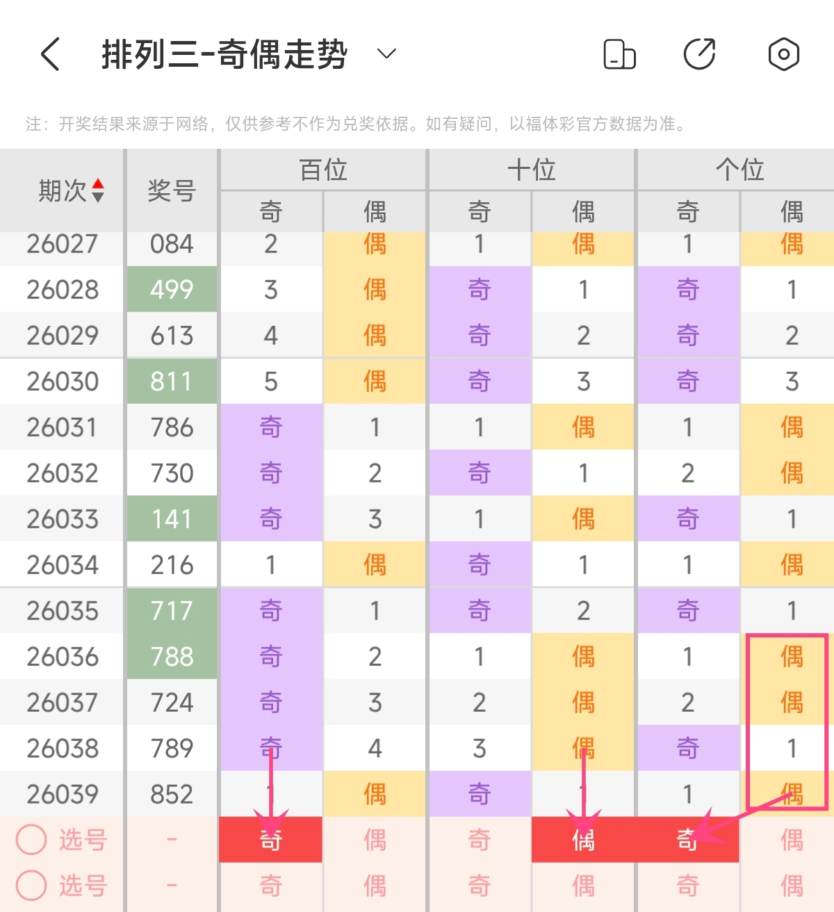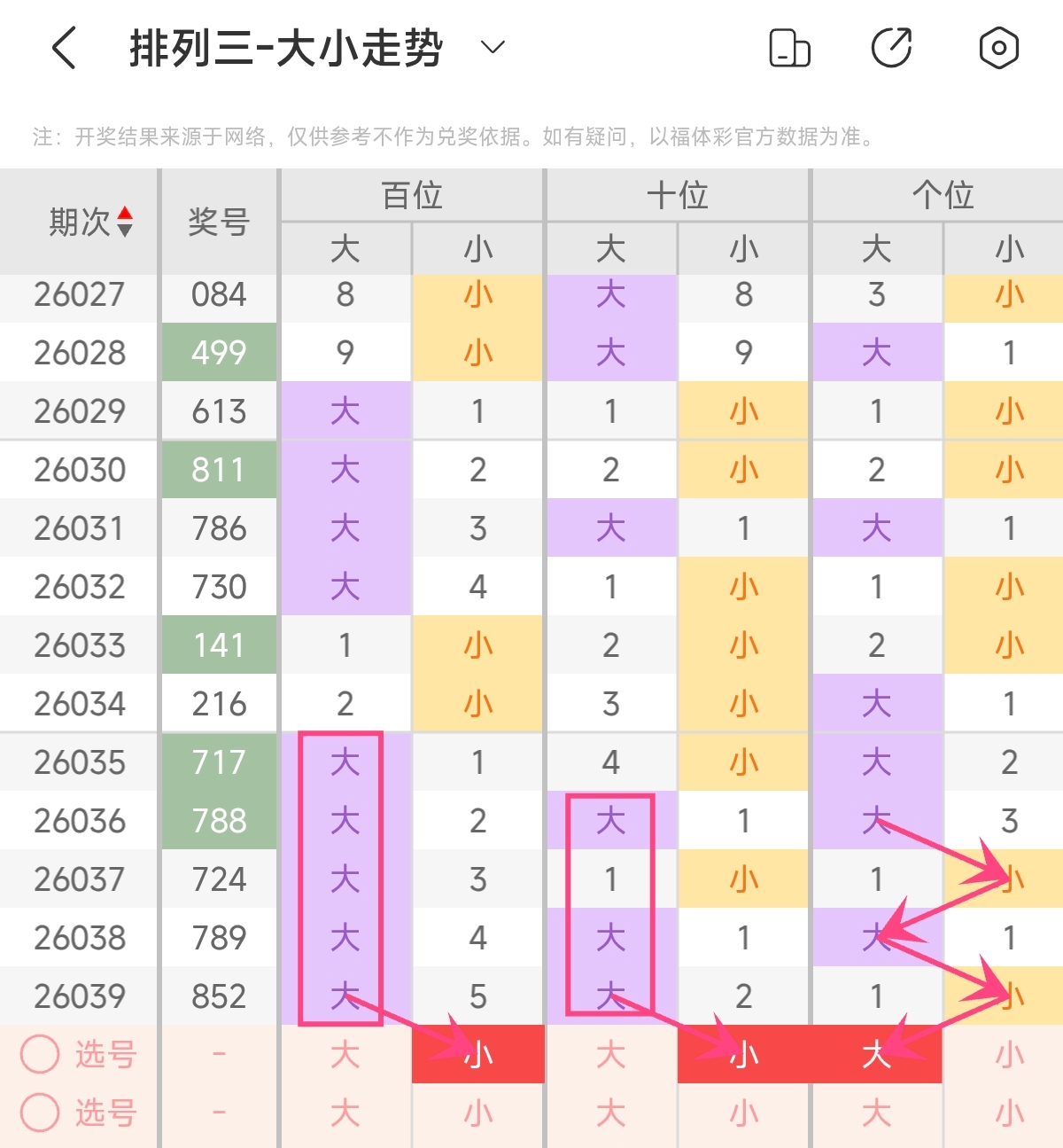首先让我们回顾一下上期排列三第2026039期开奖号码为852,为组六形态,大小比为2:1,奇偶比为1:2,跨度为6,和值为15。