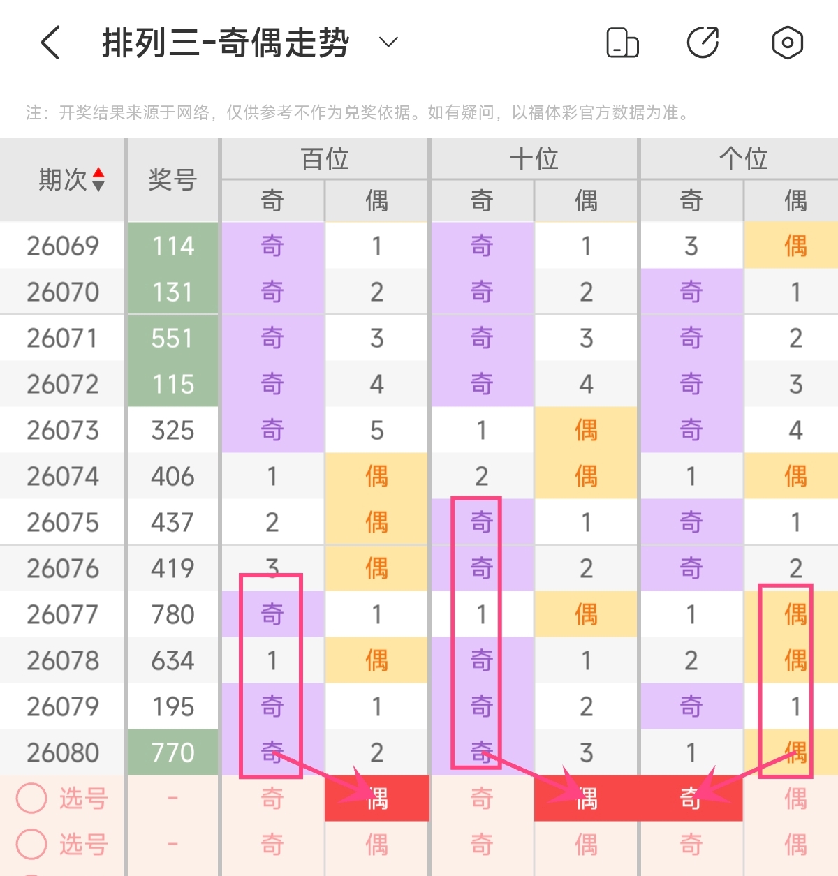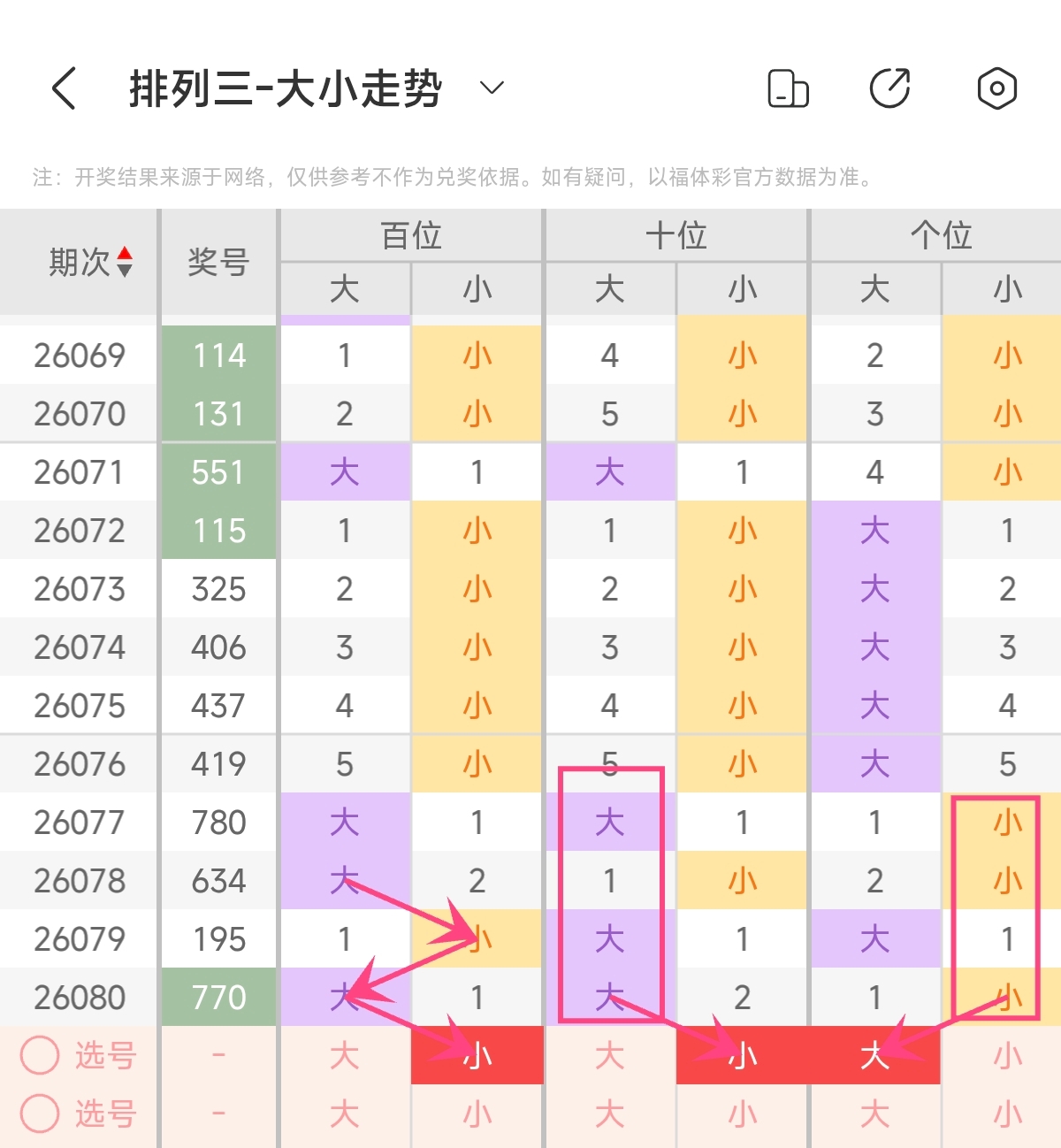 首先让我们回顾一下上期排列三第2026080期开奖号码为770,为组三形态,大小比为2:1,奇偶比为2:1,跨度为7,和值为14。