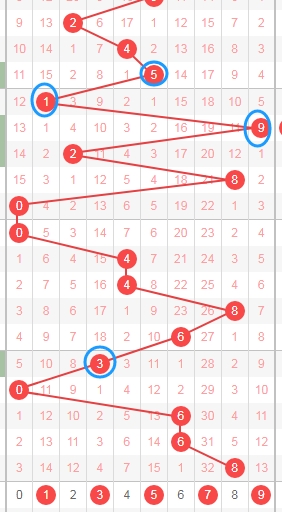 上图是体彩排列三开奖号码分布走势图从左定位分析的第一位数字,我在上图中标注出来的数字1 3 5 7 9是个人觉得可以关注的,因为你们看看上面图中标注出来的蓝色圈圈都是奇数,最近十几期开出的奇数少,那么本期应该可以关注这位数字出奇数,所以就关注1 3 5 7 9。