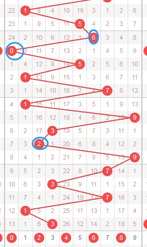 上图是体彩排列三开奖号码分布走势图从左定位分析的第二位数字,我在上图中标注出来的数字0 2 4 6 8是个人觉得可以关注的,因为你们看看上面图中标注出来的蓝色圈圈都是偶数,最近十几期开出的偶数少,尤其最近连续几期开出的号码都是奇数,那么本期应该可以关注这位数字出偶数,所以就关注0 2 4 6 8。