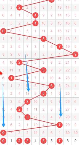上图是体彩排列三开奖号码分布走势图从左定位分析的第三位数字,我在上图中标注出来的数字0 2 3 5 7是个人觉得可以关注的,因为你们看上面我画出来的蓝色箭头都是遗漏周期大的走势,尤其最近两期开奖号码中数字0遗漏周期是12期,数字7遗漏周期9期,那么本期这位数字可以关注遗漏周期小的数字0 2 3 5 7。