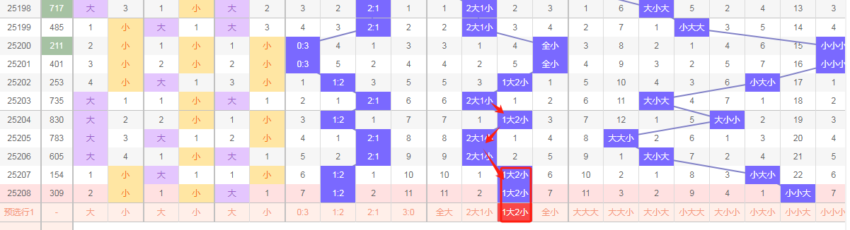 如图所示,上期开出一大两小走势,本期给的推测是一大二小,个位小码:01234,十位小码:01234,百位大码:56789,接下来推测本期奇偶比