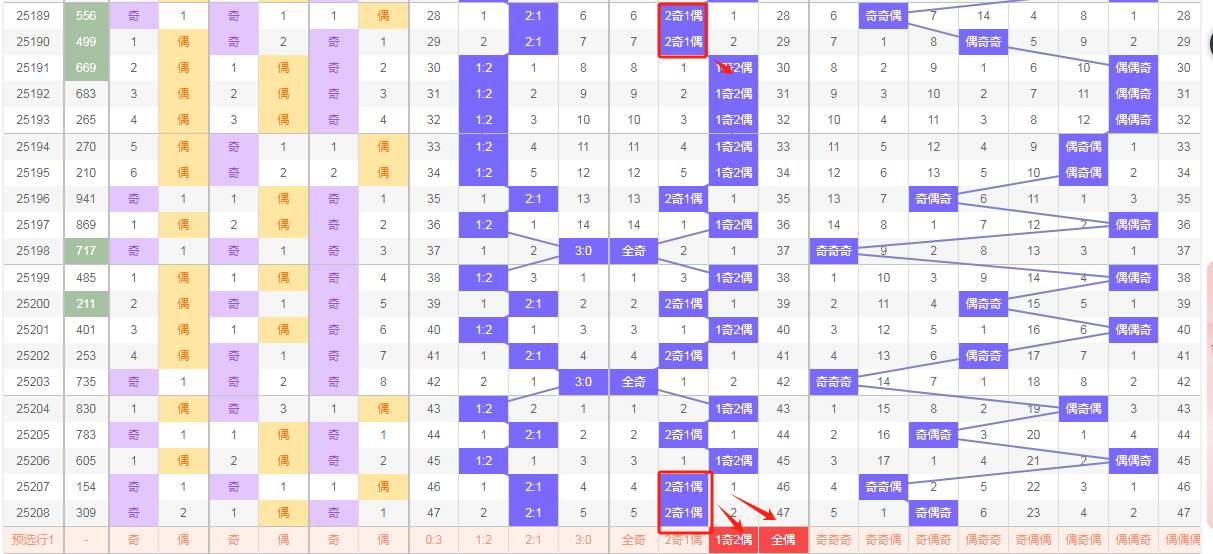 如图所示,上期开出2奇一偶,个位为奇,开一期,十位为偶开一期,百位为奇开二期,比例2:1期推测1奇2偶,防全偶。,个位为奇13579,十位为偶02468,百位为偶02468,大小比,奇偶比我们已经研测完毕,下面研测本期码数: