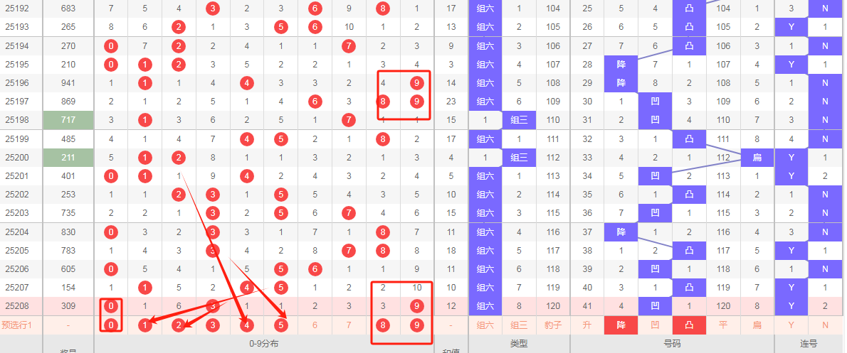 上期开出309,个位形态为9,奇数,为0路,那么本期个位形态据以往开奖数据分析,可能给出的码有以下形态,重码9,邻码8,孤码0123456,上图所示个位上期开出次数最多的03458,个位可以考虑34,十位为小为0路,那么本期十位精析,邻号1,孤码234589,十位开出最多的24569,十位考虑65,百位形态为小、奇,为0路,百位精析,重码3邻码24,孤号015689,百位出码走势最多的25689,百位考虑89,这是分开数据分析,可以有一组五码复式24589。这里根据近三十期,百位,十位,个位,号码开出次数而选的范围,具有参考价值,最终结果还得分析,百位,十位,个位,号码开出次数而选的范围,具有参考价值,最终结果还得分析。