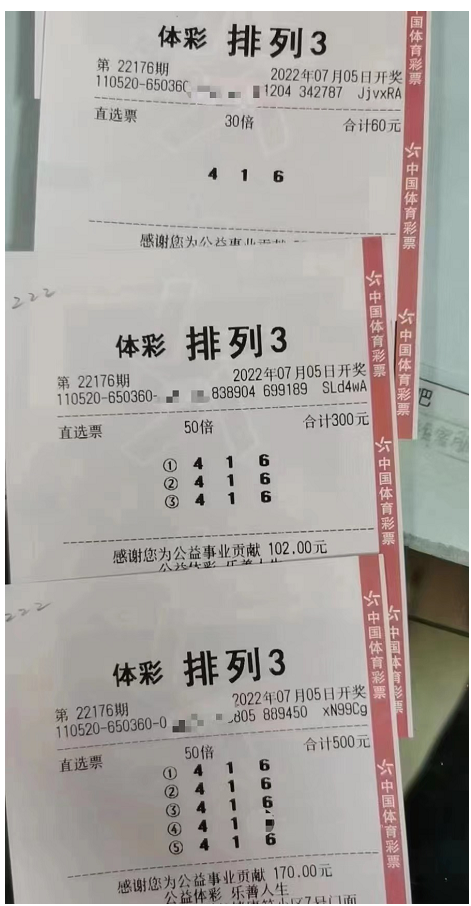 我们可以看到这3张彩票票面分别是60元、300元、500元,全部都是直选票一共投资了130倍,每张彩票都稳稳的拿捏了416,不得不承认高手真是在民间。朋友激动了一夜之后,情绪渐渐稳定了,跟我谈了谈他的购彩心得体会,说完之后不得不服别人的思路。