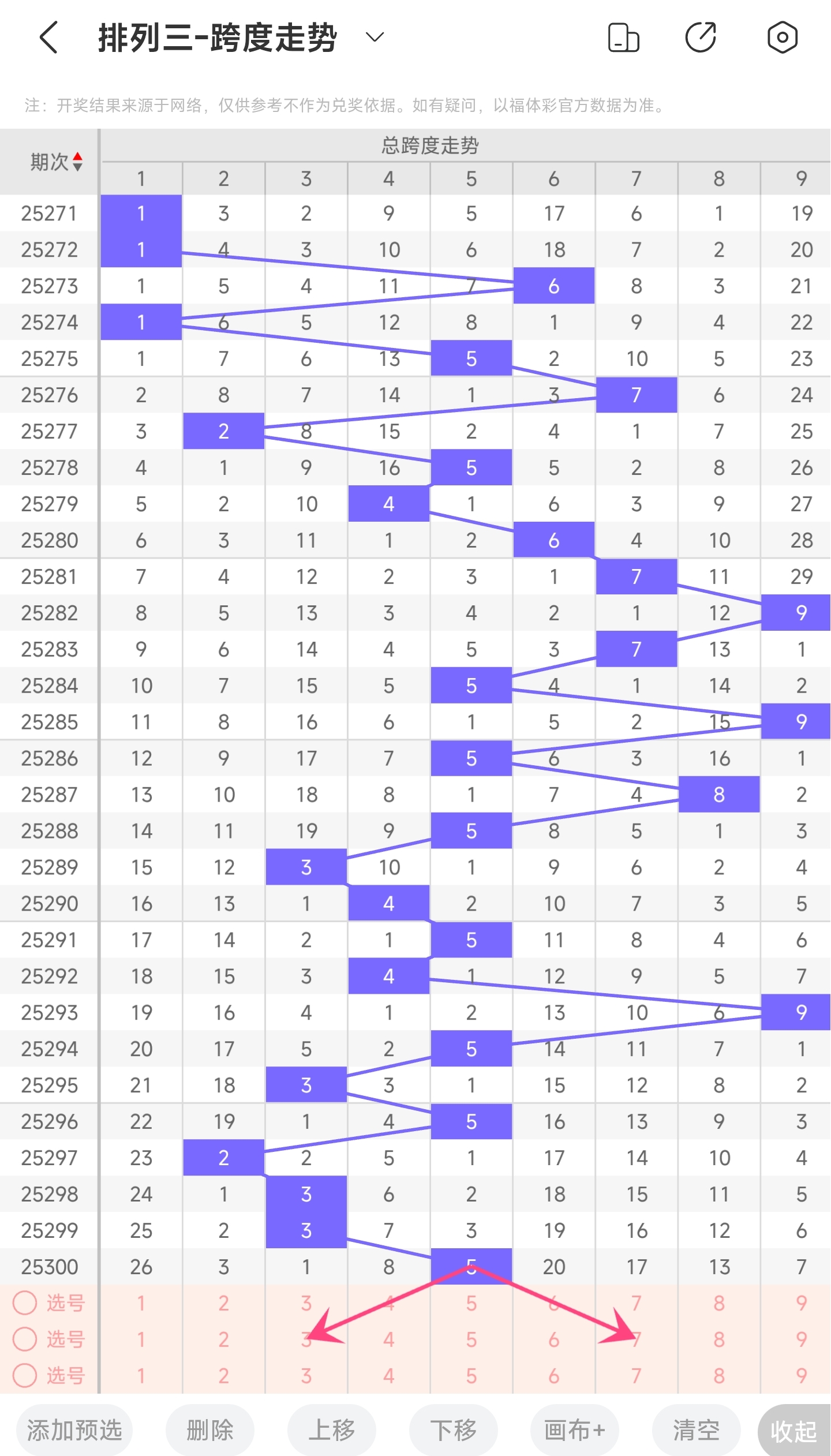 上期跨度为5,往前一期跨度是3,趋势往右移动,偏移量为2。跨度值5时,跨度值是近30期内开出中间位置的值。通过走势图分析,目前的趋势是可能往左也可能往右。所以推测本期跨度可能为23478等跨度。