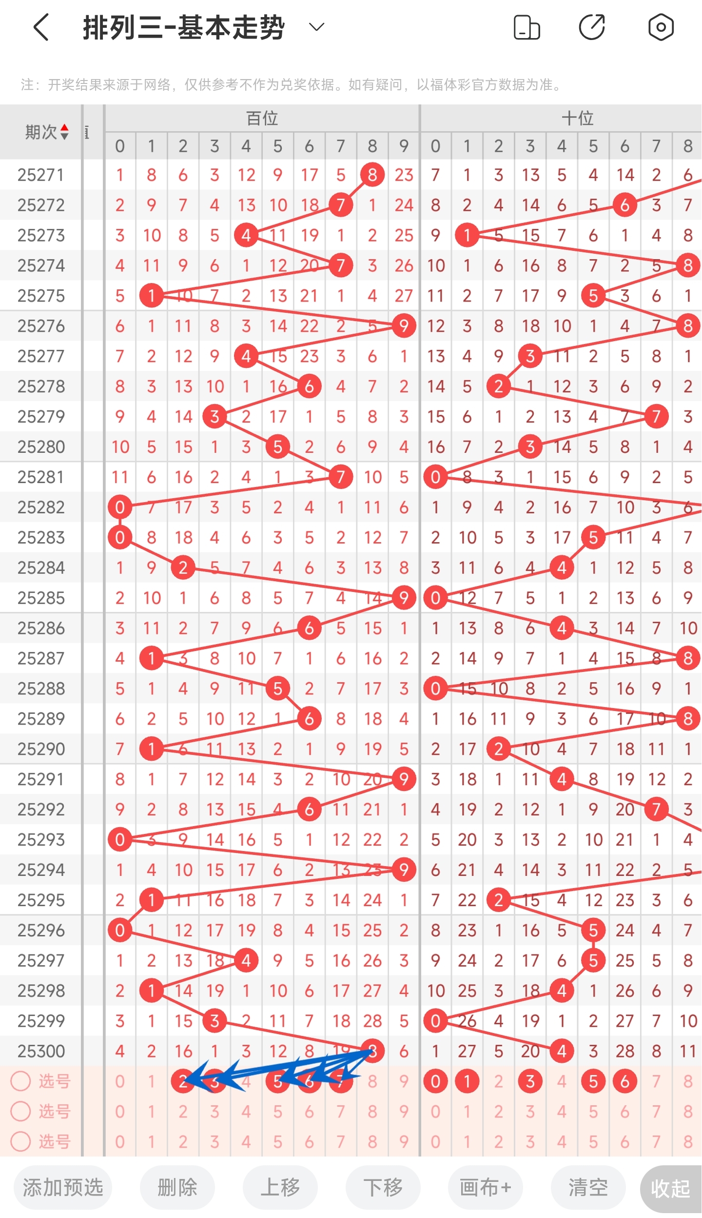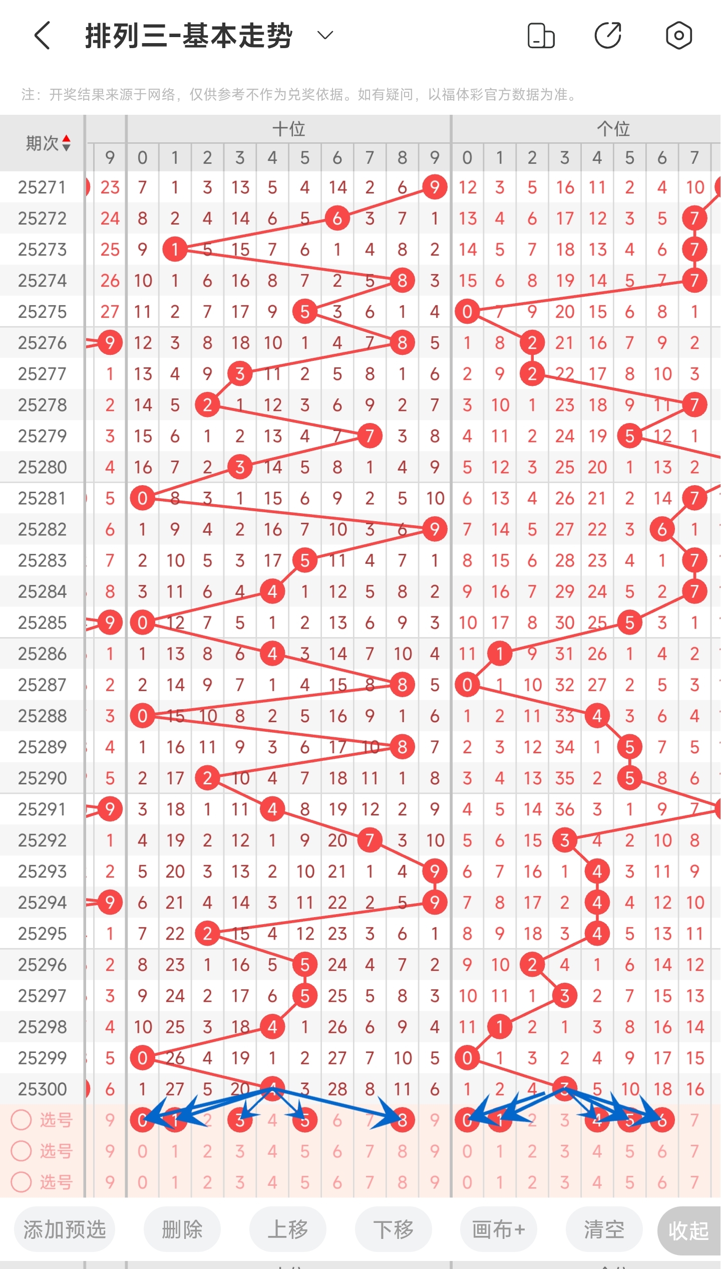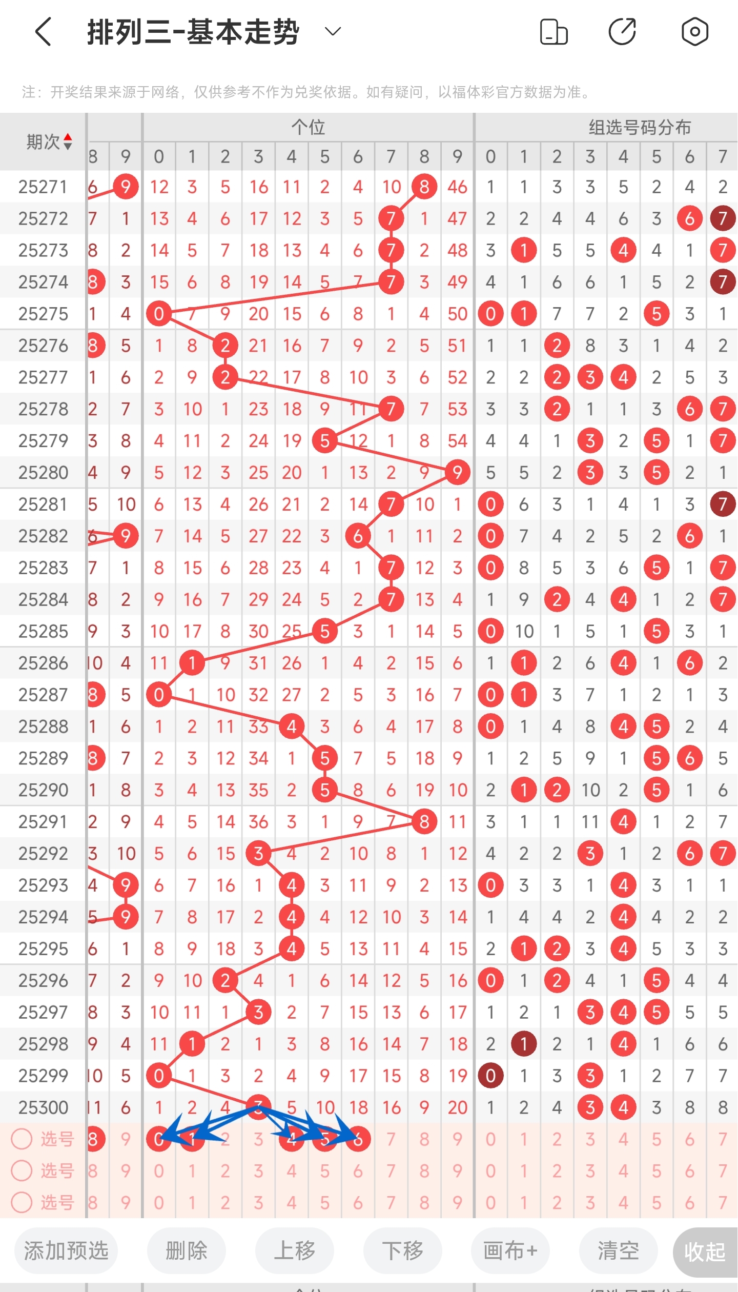 上期开出的是3号,往前一期是0号。趋势往右移动,偏移量是3。通过走势图分析,可以看到目前趋势是可能往左也可能往右。从偏移量来看,个位偏移量比较稳定,都开小偏移量的号码,本期继续关注小偏移量的号码。最后再结合遗漏期数和冷热号,我们可以关注01456等号。综上所述本期推测可能开出01456等数。