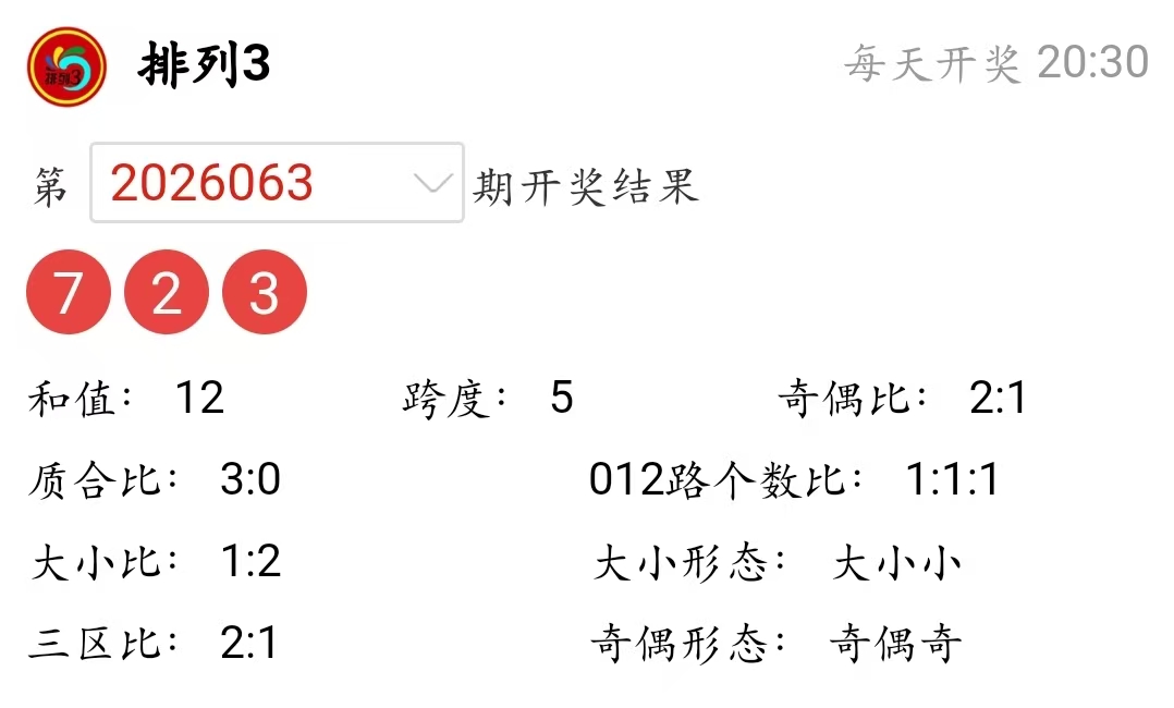 排列3上期(2026063)开奖号码详情