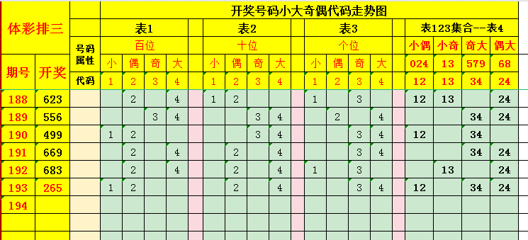 (一)用开奖号码构建一个“小大奇偶”代码转换体系。 首先把0123456789十个开奖数字,按照数字的“小大奇偶”属性,设定与1234相对应的代码即:小数01234代码为“1”;偶数02468的代码为“2”;奇数13579的代码为“3”,大数56789的代码为“4”;根据以上规则,并依据开奖号码分别搭建出百位、十位、个位的“小大奇偶”代码走势图,具体表述如下: (1)百位号码转换:当开奖号码的百位为小数时转换代码为 1;为偶数时转换代码为 2;为奇数时转换代码为 3;为大数时转换代码为4。见下表1;