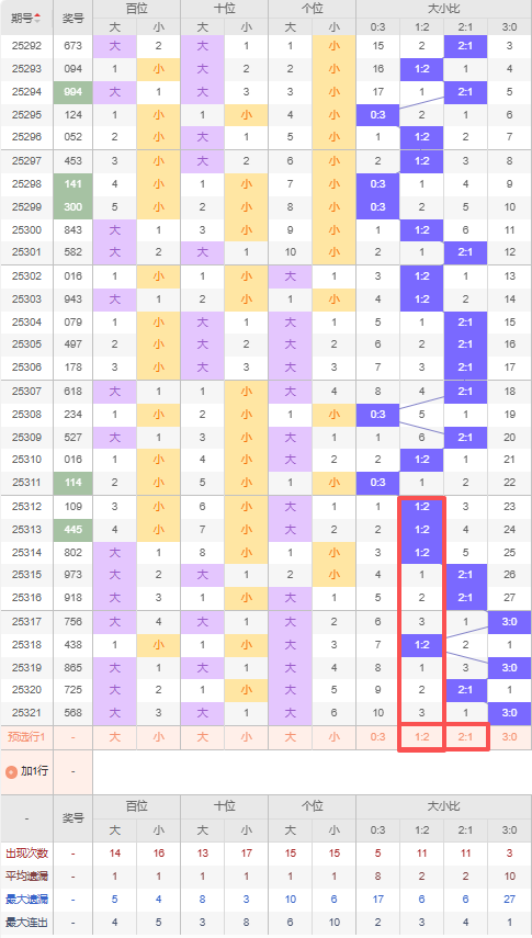 上期大小比:3:0,近10期大小比出现情况:1:2、1:2、1:2、2:1、2:1、3:0、1:2、3:0、2:1、3:0,最近10期出3期2:1,出现4期1:2,出现0期0:3,出现3期3:0,根据近10期出号规律本期推荐隔期开出2:1,防遗漏3期出1:2,综上所述大小比推荐:防:1:2,重点关注:2:1。