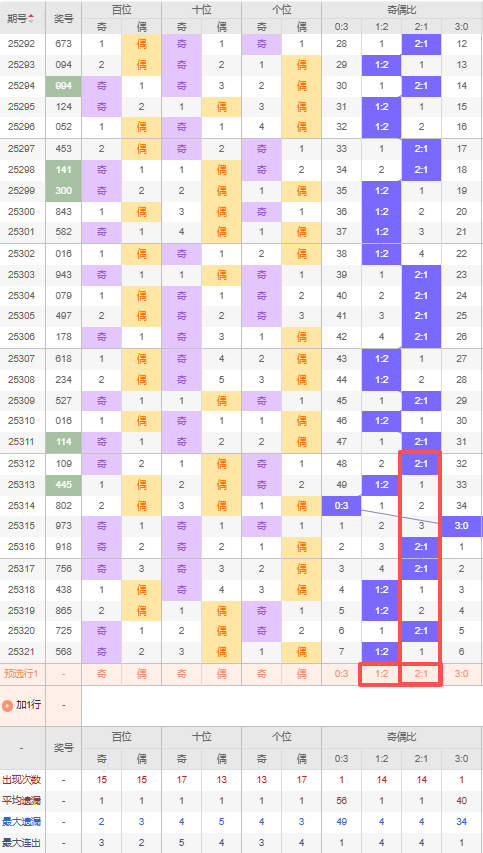 上期奇偶比:1:2,近10期奇偶比出现情况:2:1、1:2、0:3、3:0、2:1、2:1、1:2、1:2、2:1、1:2,最近10期出现4期2:1,出现4期1:2,出现1期0:3,出现1期3:0,根据近10期出号规律本期推荐连出1:2,防隔期出2:1,综上所述奇偶比推荐:防:2:1,重点关注:1:2。
