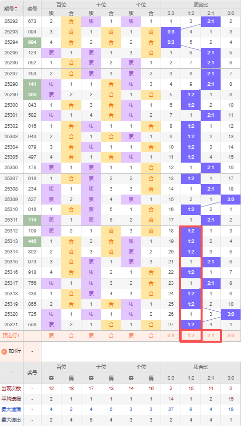 上期质合比:1:2,近10期质合比出现情况:1:2、1:2、1:2、2:1、1:2、2:1、1:2、1:2、3:0、1:2,最近10期出现2期2:1,出现7期1:2,出现0期0:3,出现1期3:0,根据近10期规律本期推荐连出1:2,防遗漏4期出2:1,综上所述质合比推荐:防:2:1,重点关注:1:2。