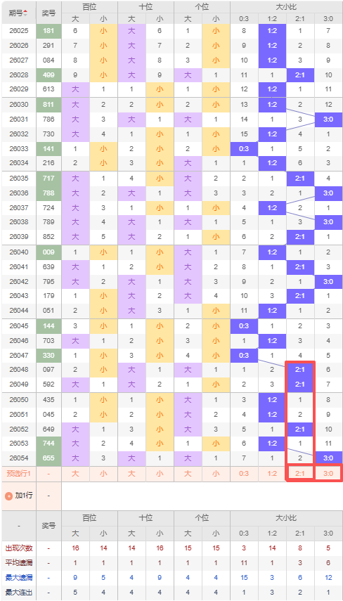 上期大小比:3:0,近10期大小比出现情况:0:3、1:2、0:3、2:1、2:1、1:2、1:2、2:1、1:2、3:0,最近10期出3期2:1,出现4期1:2,出现2期0:3,出现1期3:0,根据近10期出号规律本期推荐遗漏2期出2:1,防连出3:0,综上所述大小比推荐:防:3:0,重点关注:2:1。