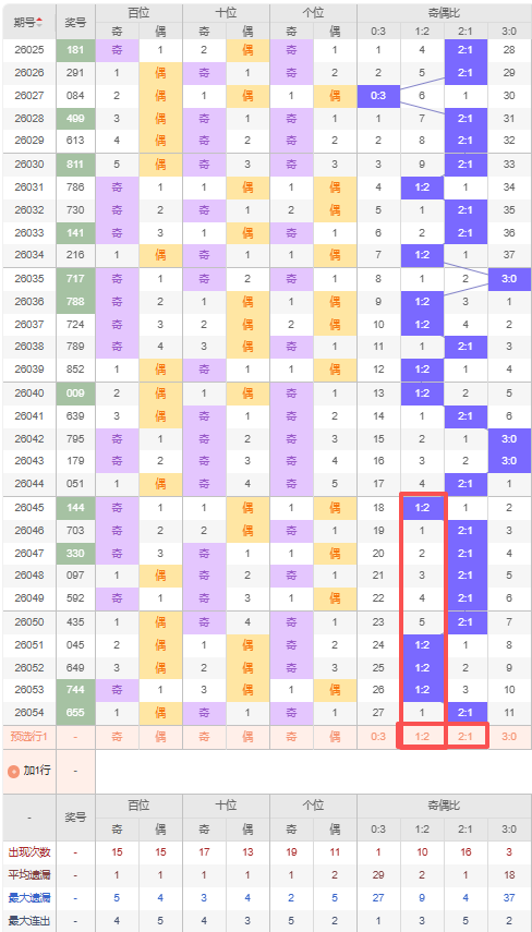 上期奇偶比:2:1,近10期奇偶比出现情况:1:2、2:1、2:1、2:1、2:1、2:1、1:2、1:2、1:2、2:1,最近10期出现6期2:1,出现4期1:2,出现0期0:3,出现0期3:0,根据近10期出号规律本期推荐隔期出1:2,防连出2:1,综上所述奇偶比推荐:防:2:1,重点关注:1:2。
