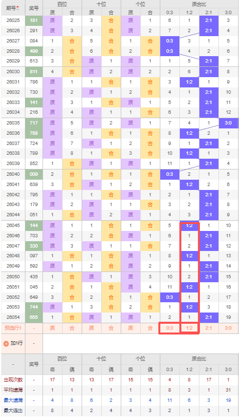 上期质合比:2:1,近10期质合比出现情况:1:2、2:1、2:1、1:2、2:1、2:1、1:2、0:3、1:2、2:1,最近10期出现5期2:1,出现4期1:2,出现1期0:3,出现0期3:0,根据近10期规律本期推荐遗漏2期出0:3,防隔期出1:2,综上所述质合比推荐:防:1:2,重点关注:0:3。