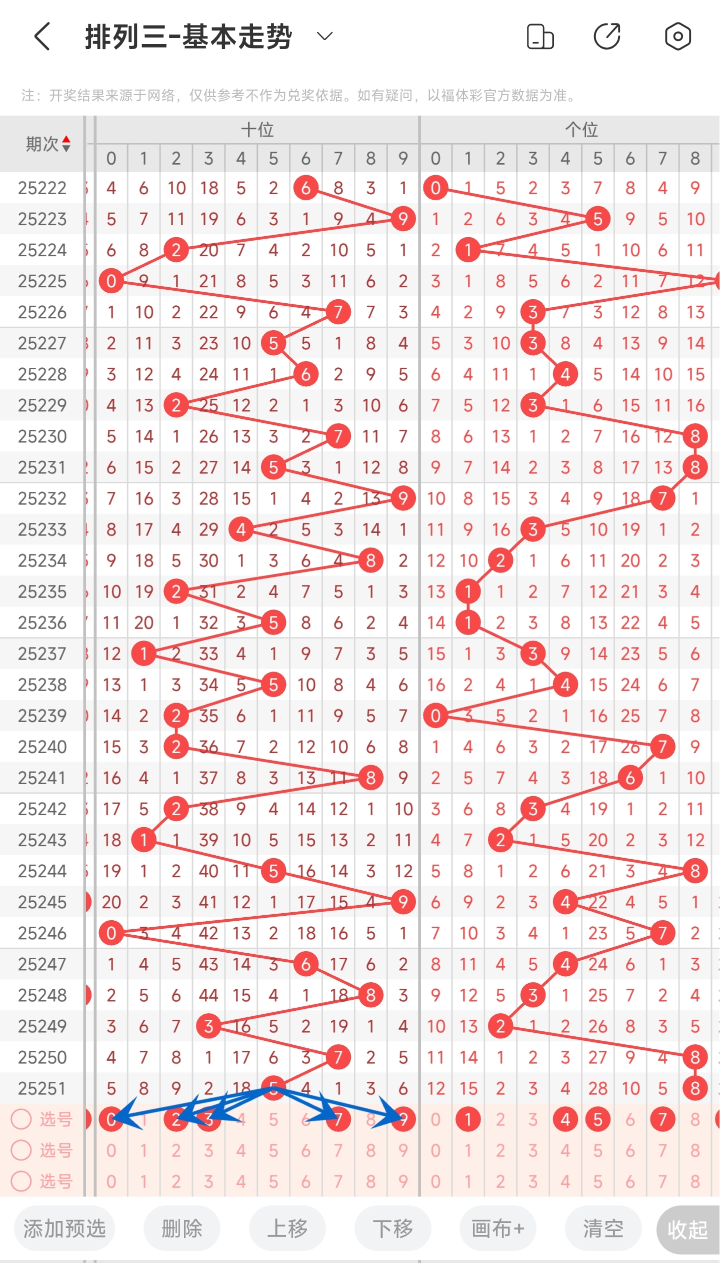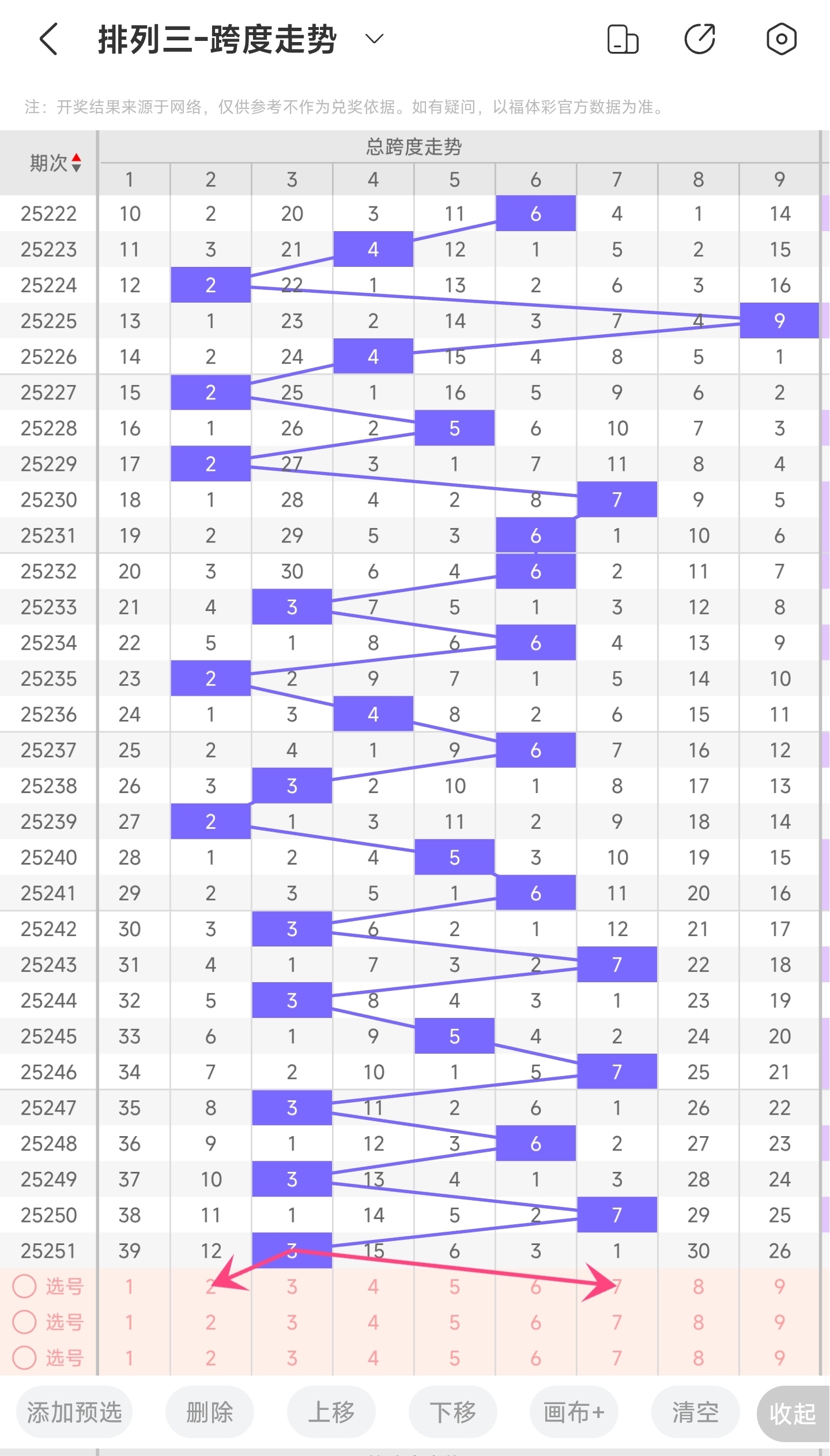 上期跨度为3,往前一期跨度是7,往左移动了4个点,偏移量为4。跨度值为3时,跨度值是近30期内开出的较小位置的值。通过走势图分析,目前的趋势是大概率往右,小概率继续往左。所以推测本期跨度可能为25678等跨度。