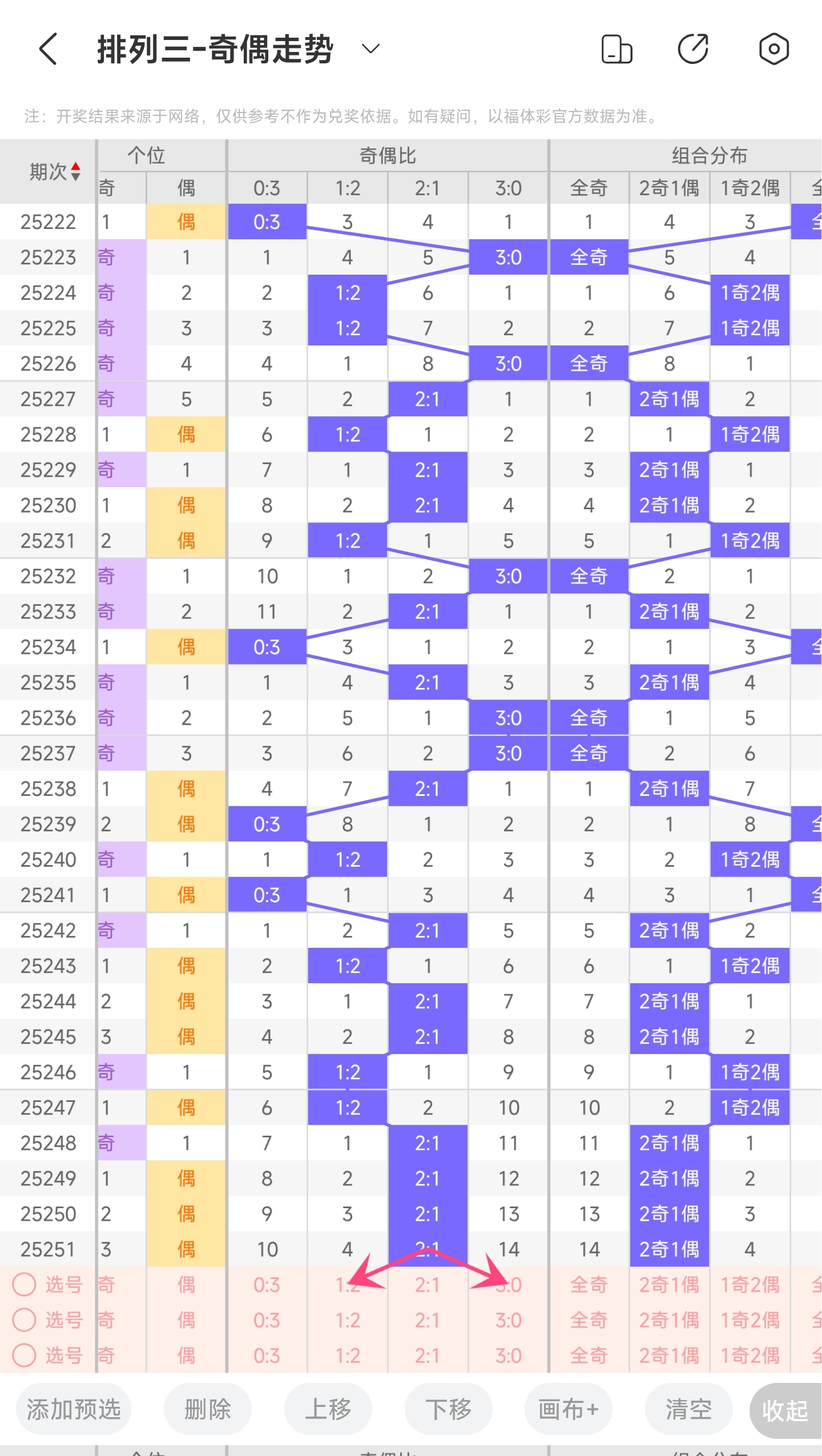 上期开出了2:1的奇偶比。往前一期是2:1奇偶比。通过分析奇偶走势图,近30期内开出1:2奇偶比的次数是8次,开出2:1奇偶比的次数是13次,3:0是5次,0:3是4次。和前一期相比,3:0奇偶比次数变少了,2:1奇偶比次数变多了。通过走势图分析,可以看到0:3或者3:0奇偶比开出的情况是要比1:2和2:1奇偶比少的,而2:1和1:2奇偶比整体情况下会轮流开出,2:1奇偶比已经连开4期了,继续开出的概率已经非常小了,所以本期较大概率会开其它类型。同时3:0也遗漏了一定期数,有可能会开出。所以推测本期比较大概率会开1:2或者3:0奇偶比,小概率继续开2:1奇偶比,更小的概率开0:3奇偶比。