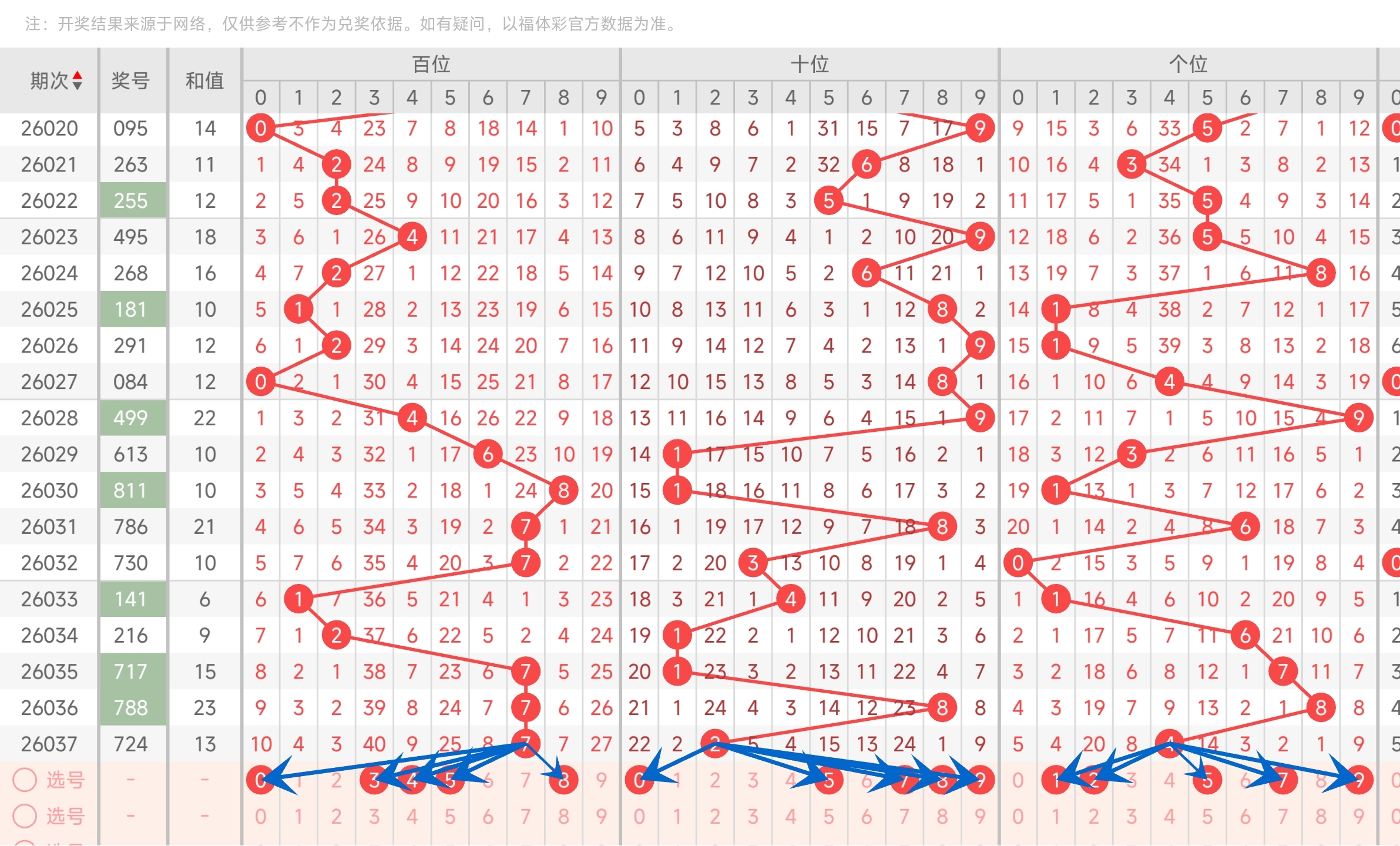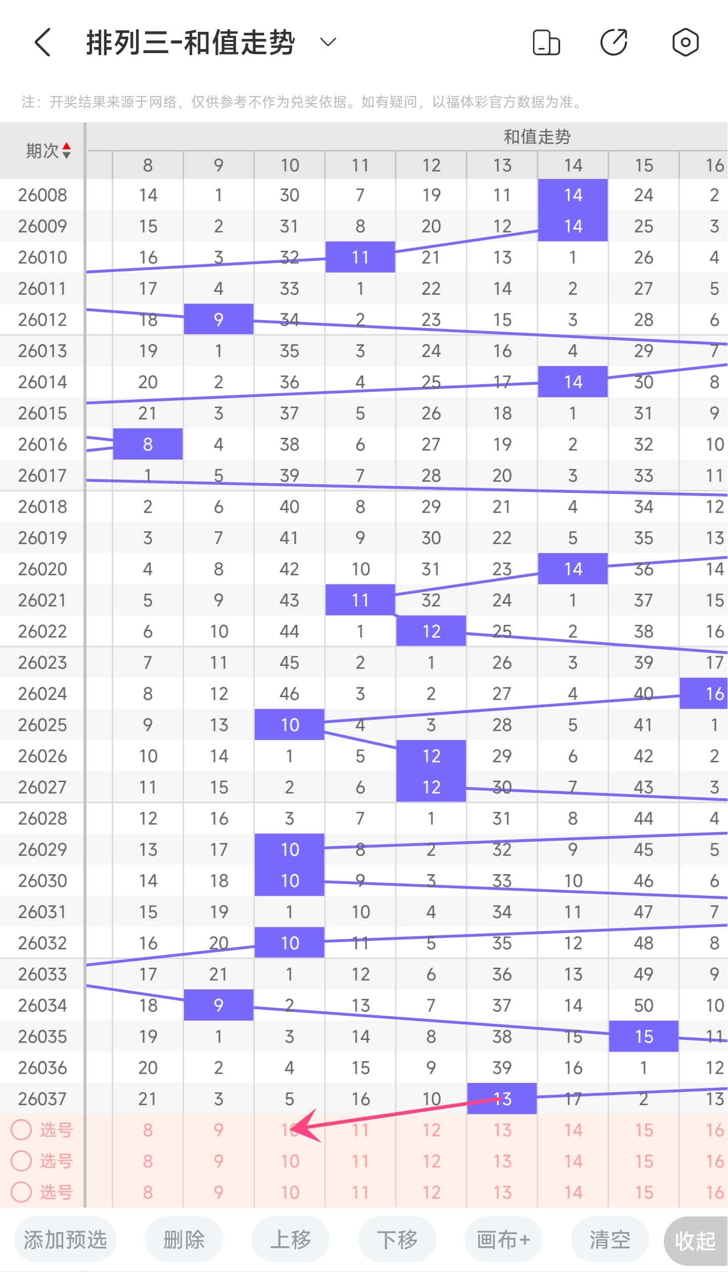 上期和值为13,往前一期和值为23,趋势往左移动,偏移量为10。通过走势图分析,13和值是近30期内开出比较小的和值,上升空间很大,下降空间比较小。但本期看好和值变小,因此推测本期趋势是往左的,和值会变小,小概率往右,和值变大。