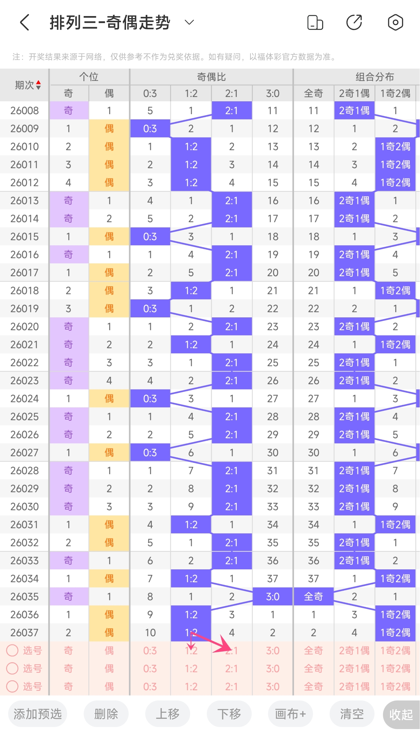 上期开出了1:2的奇偶比。往前一期是1:2奇偶比。通过分析奇偶走势图,近30期内开出1:2奇偶比的次数是9次,开出2:1奇偶比的次数是15次,3:01次,0:35次。和前一期相比,次数没有变化。通过走势图分析,上期开1:2奇偶比,本期看好2:1奇偶比。所以推测本期可能开2:1奇偶比,其次是1:2奇偶比,最后是3:0或者0:3奇偶比。