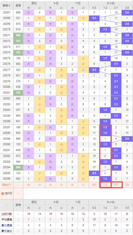 上期大小比:1:2,近10期大小比出现情况:1:2、1:2、3:0、1:2、2:1、2:1、1:2、2:1、0:3、1:2,最近10期出3期2:1,出现5期1:2,出现1期0:3,出现1期3:0,根据近10期出号规律本期推荐遗漏2期的2:1,防连出1:2,综上所述大小比推荐:防:1:2,重点关注:2:1。
