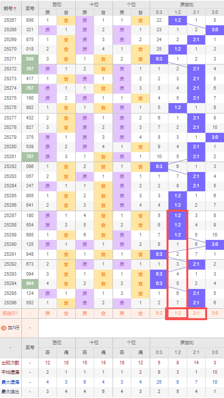 上期质合比:2:1,近10期质合比出现情况:1:2、1:2、1:2、3:0、0:3、2:1、0:3、0:3、2:1、2:1,最近10期出现3期2:1,出现3期1:2,出现3期0:3,出现1期3:0,根据近10期规律本期推荐三连出2:1,防遗漏7期的1:2,综上所述质合比推荐:防:1:2,重点关注:2:1