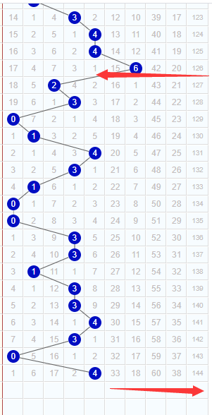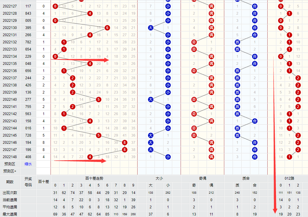 百十差的振幅想必大家都明白,就是上下两期百十差的距离,比如148期开奖408,百十差为4,147期开奖196,百十差为8,两者振幅就是4。通过振幅图表就很容易看到百十差振幅为5、6、7、8、9的数据,许久未开出,近期一定要关注百十差走出大振幅。有了这个概念就好办多了,结合百十差将要开出除3余数为0的号码,两者双管齐下,就能速度的锁定未来的排三单选号码。