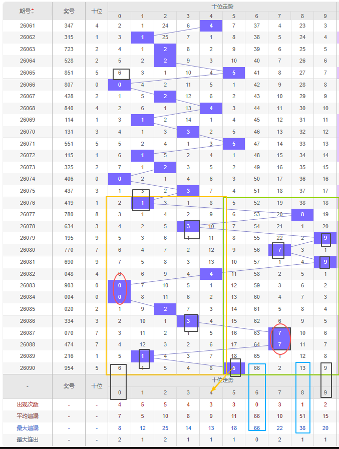 体彩排列3第2026091期的个位首先分析奇偶数号,如图所示近15期开出了3期奇数12期偶数,开出奇数概率比开出偶数概率要小4倍,那么近五期全部都开出了偶数号,本期可以继续考虑奇数号,比如遗漏期数十期以上的1号和7号,可以防冷号开出。杀号建议定在偶数号,但遗漏期数较大的号02号和06号,遗漏了十期以上而且2号达到了最大遗漏期数,建议考虑防冷号开出。
